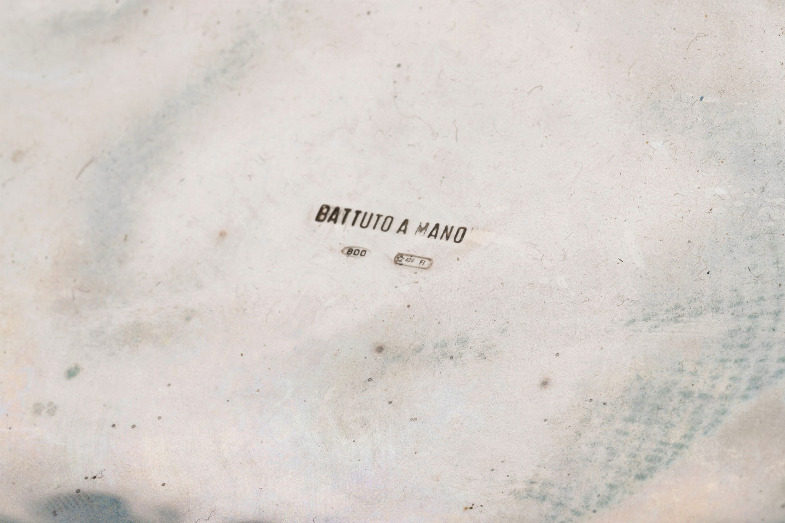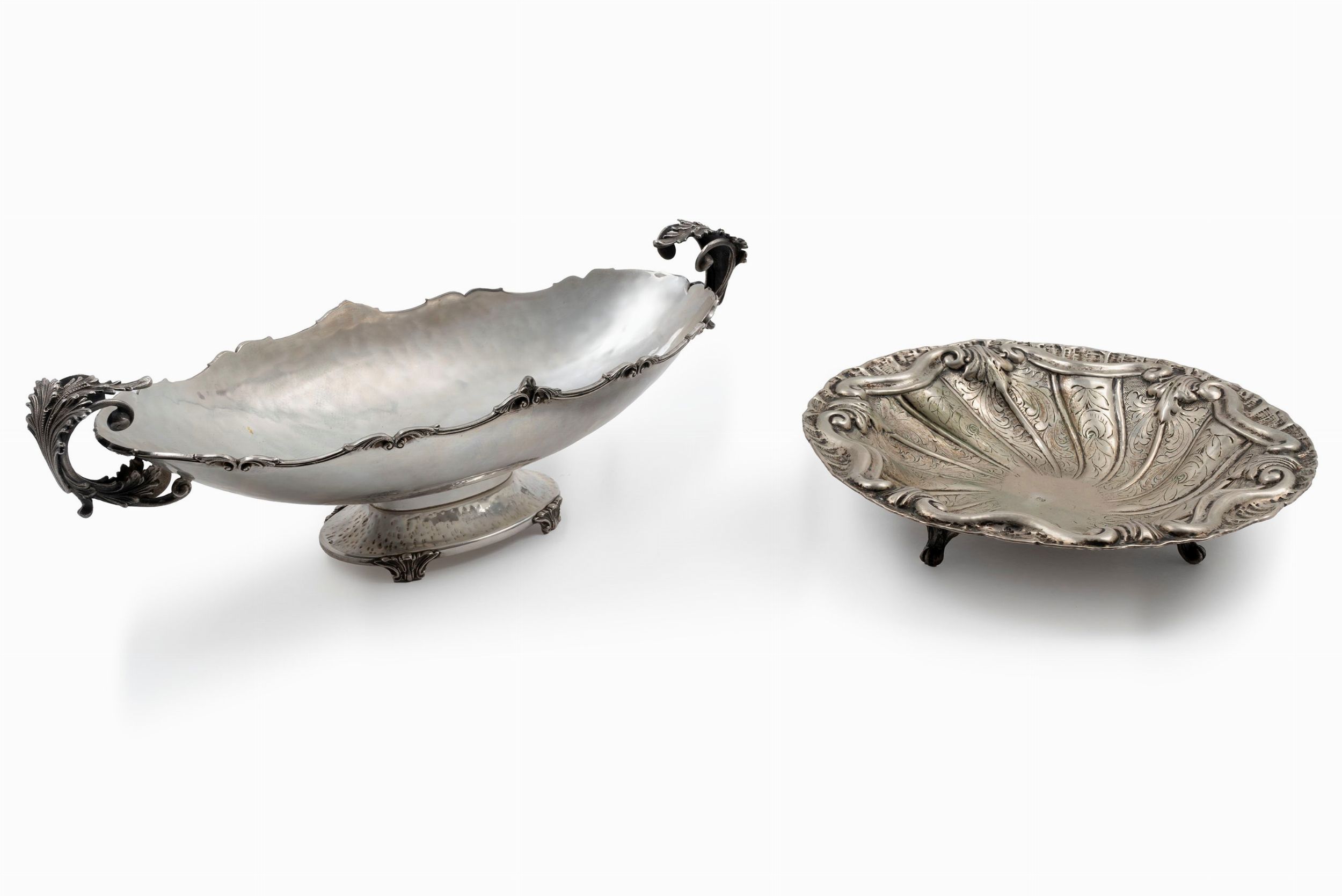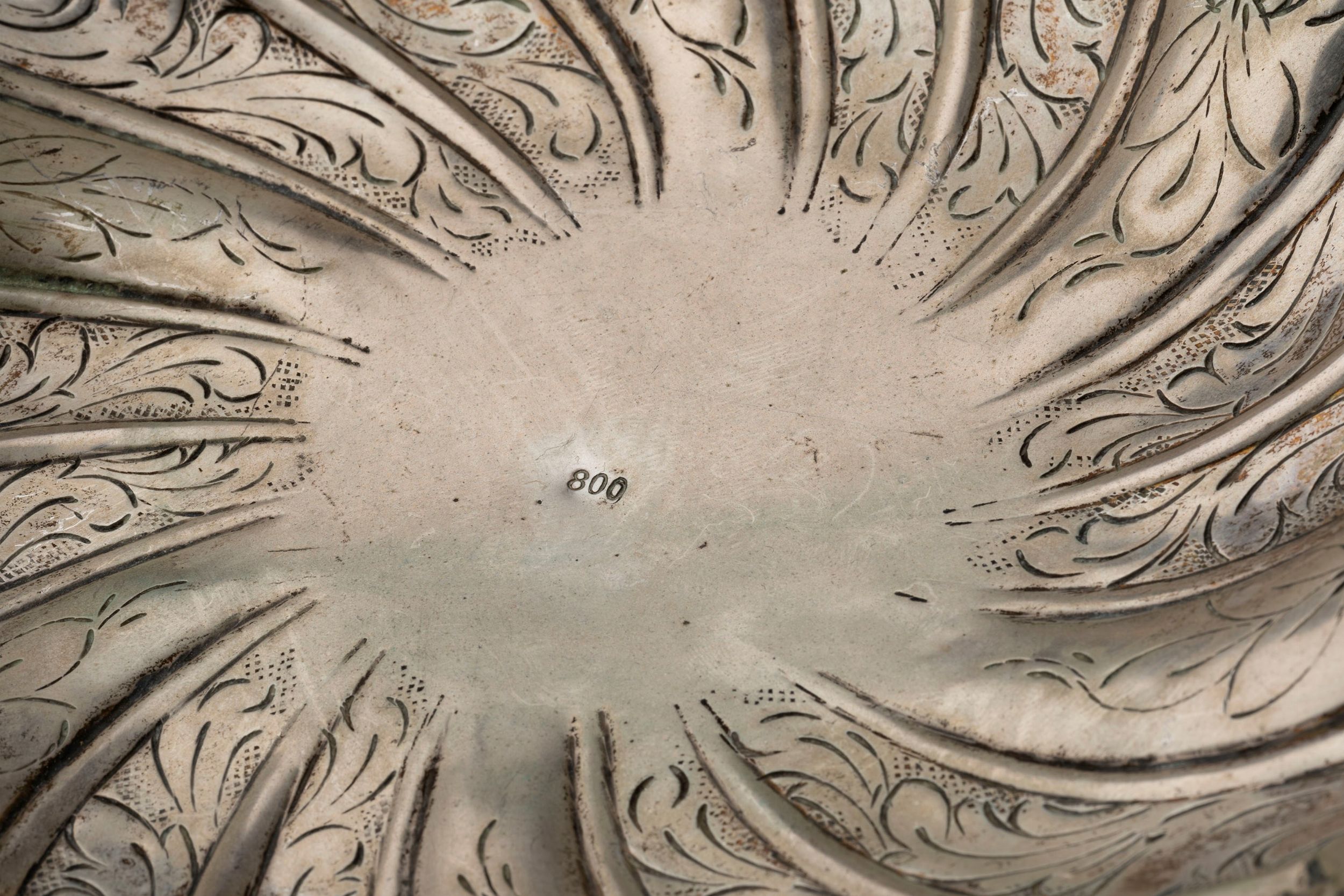 Italia, XX secolo piatto circolare poggiante su tre piedini zoomorfi, interamente lavorato con decori a sbalzo e cesello a motivi floreali e volute, centrotavola di forma ovale con bordo decorato a volute e manici a foglie e riccioli.