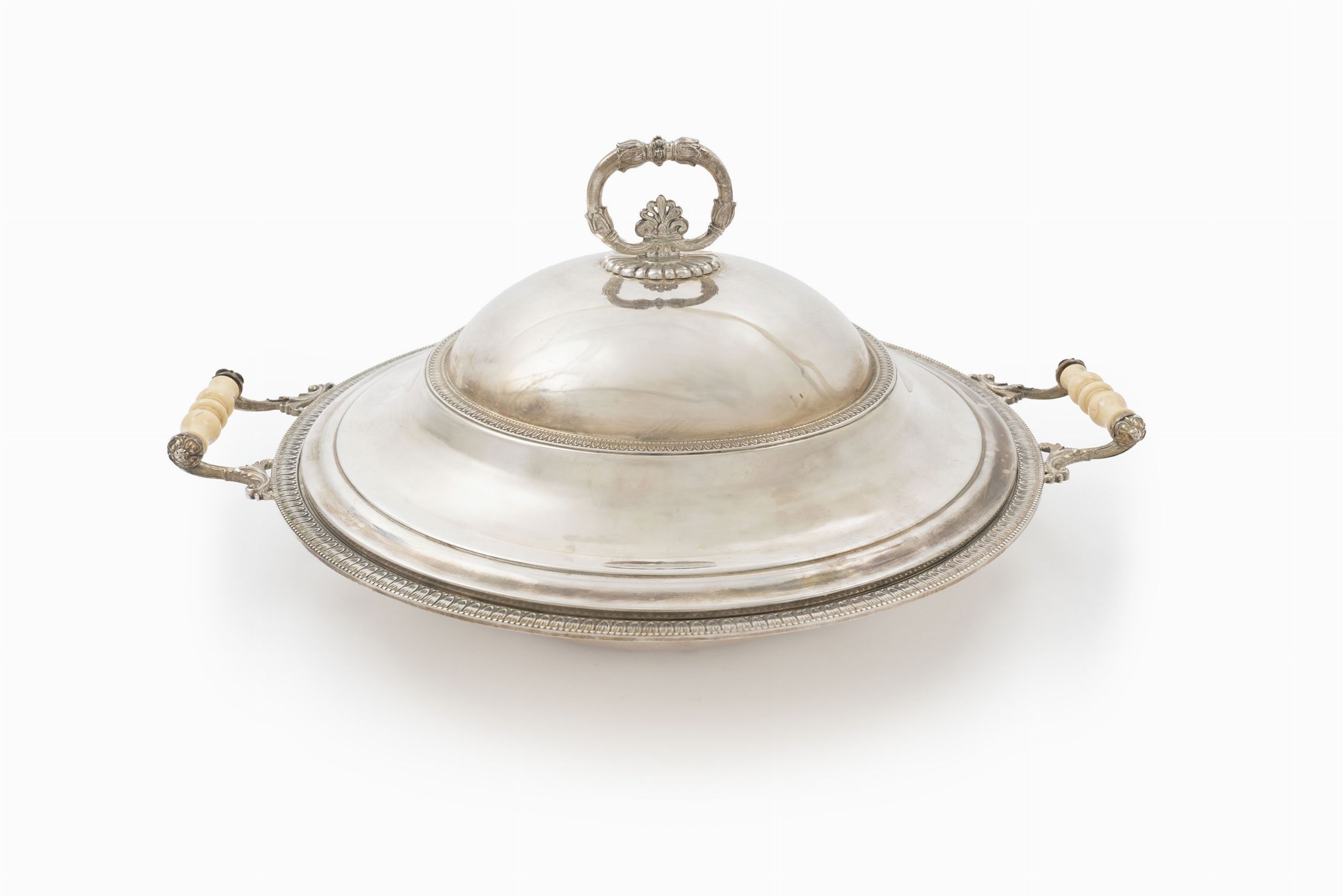 Italia, XX secolo di forma rotonda con manici in osso, coperchio con presa a motivi fogliacei, decoro in stile Impero.