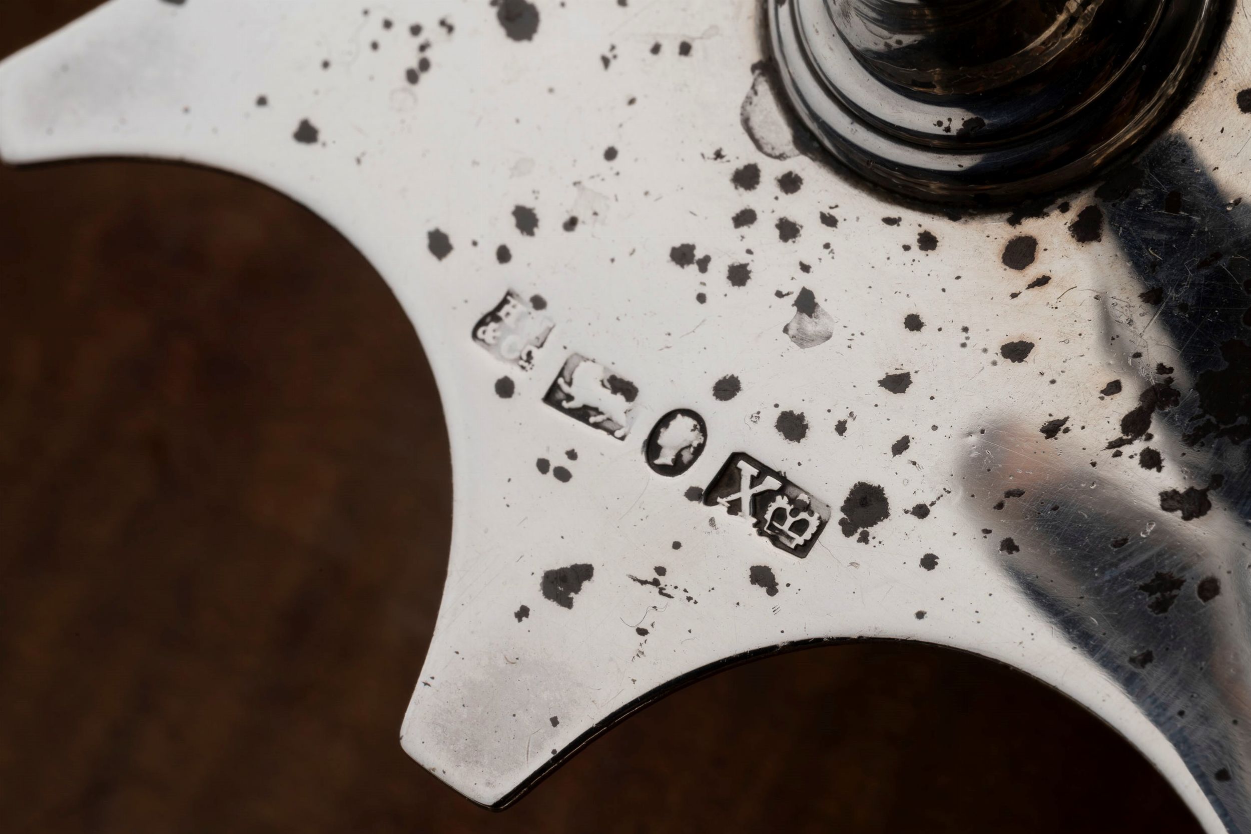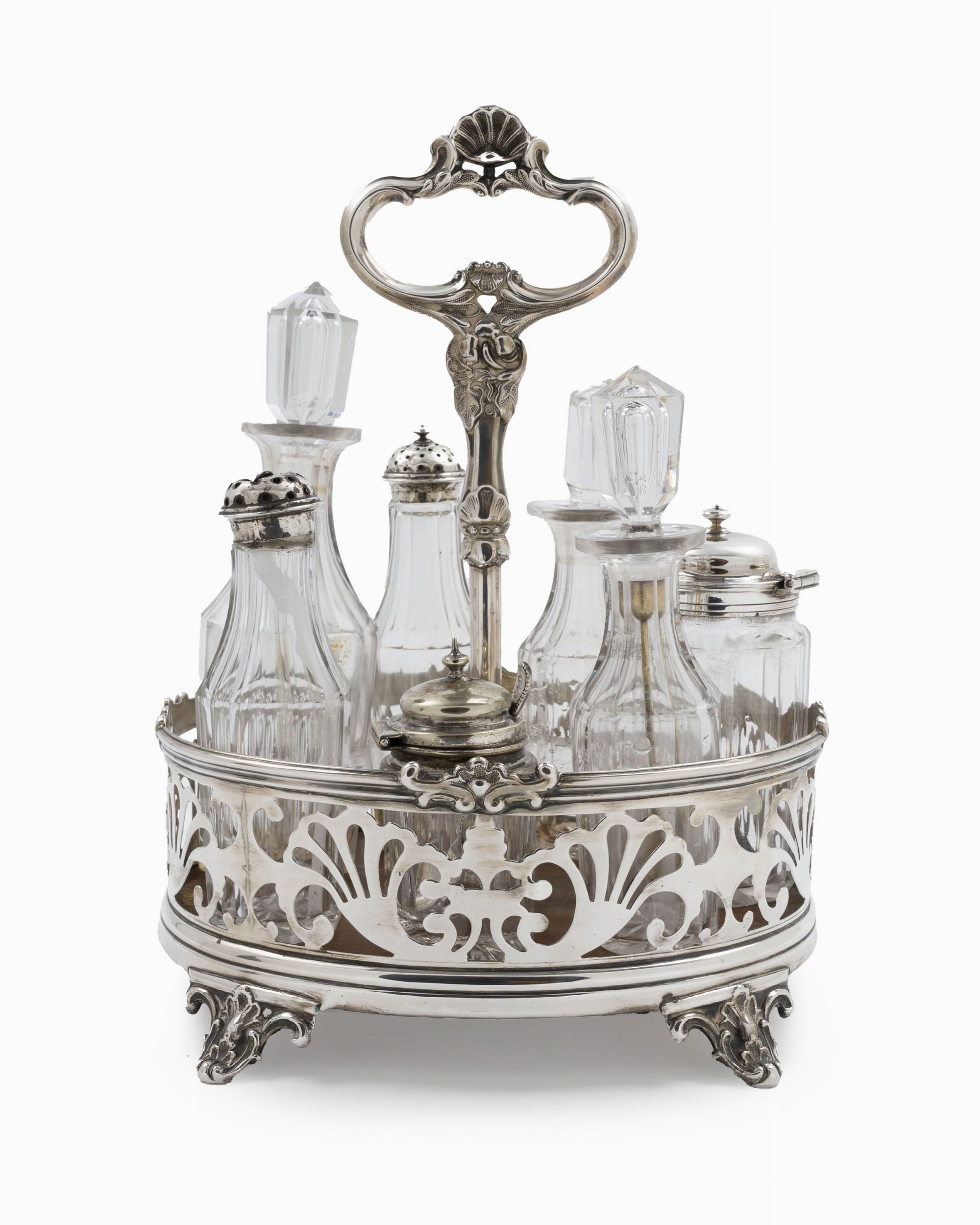 Inghilterra, 1842 base ovale con quattro piedini a volute, interamente traforata, presa ad anello con sette ampolle, difetti (sbeccature e ammaccature).