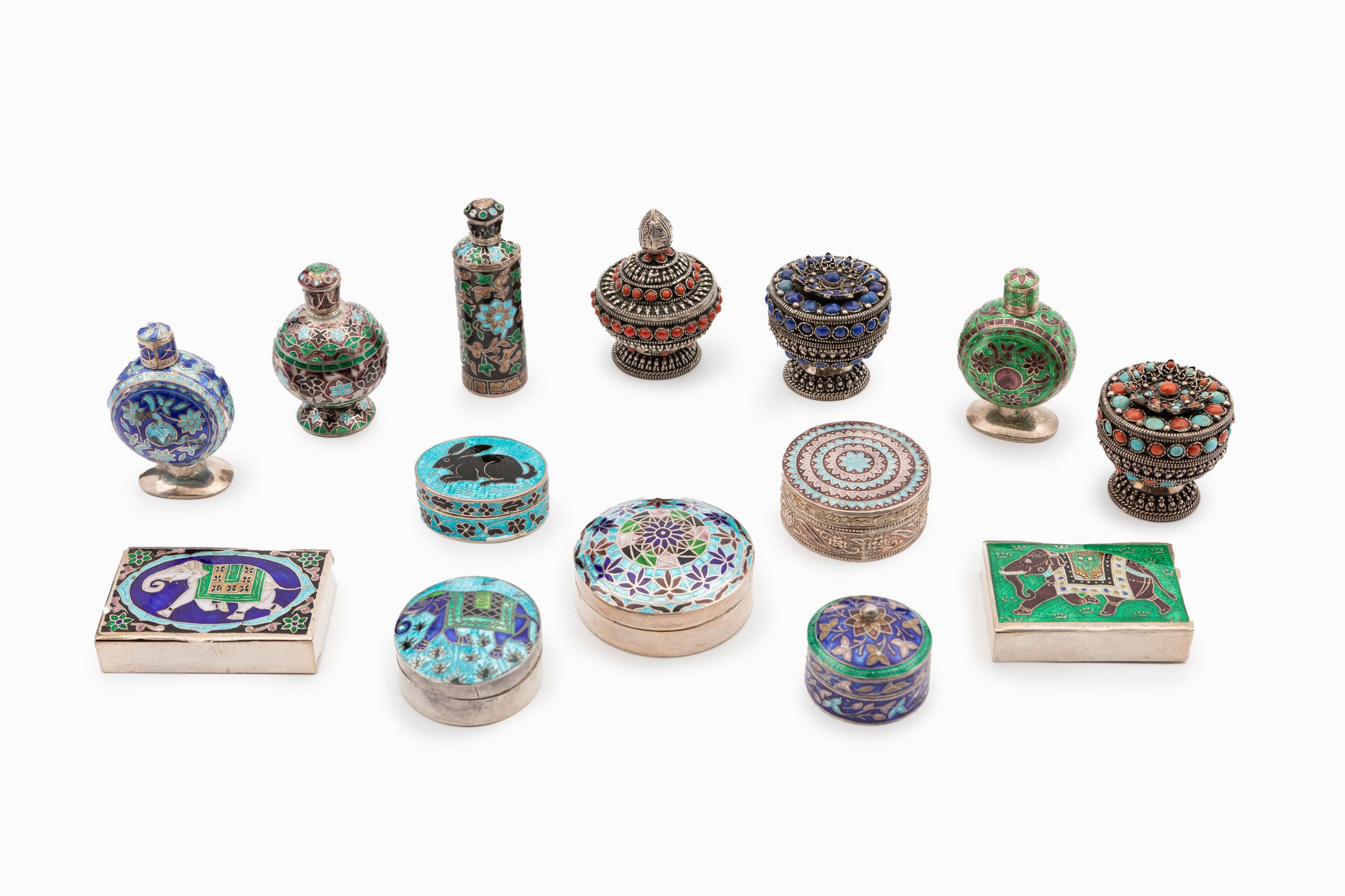 India, inizi XX secolo tre bottigliette e undici scatolette, di forme e misure diverse, decorate con smalti policromi, coralli, lapislazzuli e pietre dure.