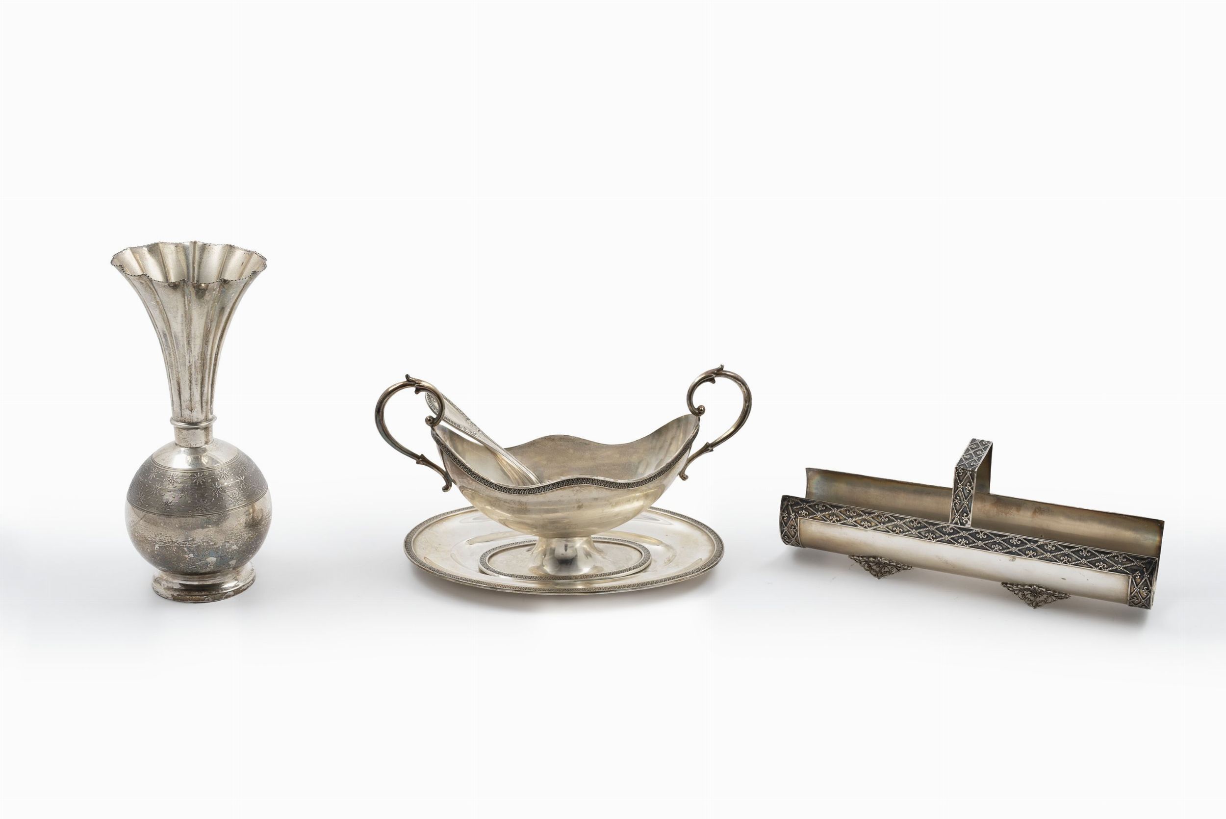 Italia, XX secolo salsiera a doppio manico con cucchiaio, vaso con decori a bulino, porta grissini poggiante su quattro piedini traforati e profilo con decori a rilievo.