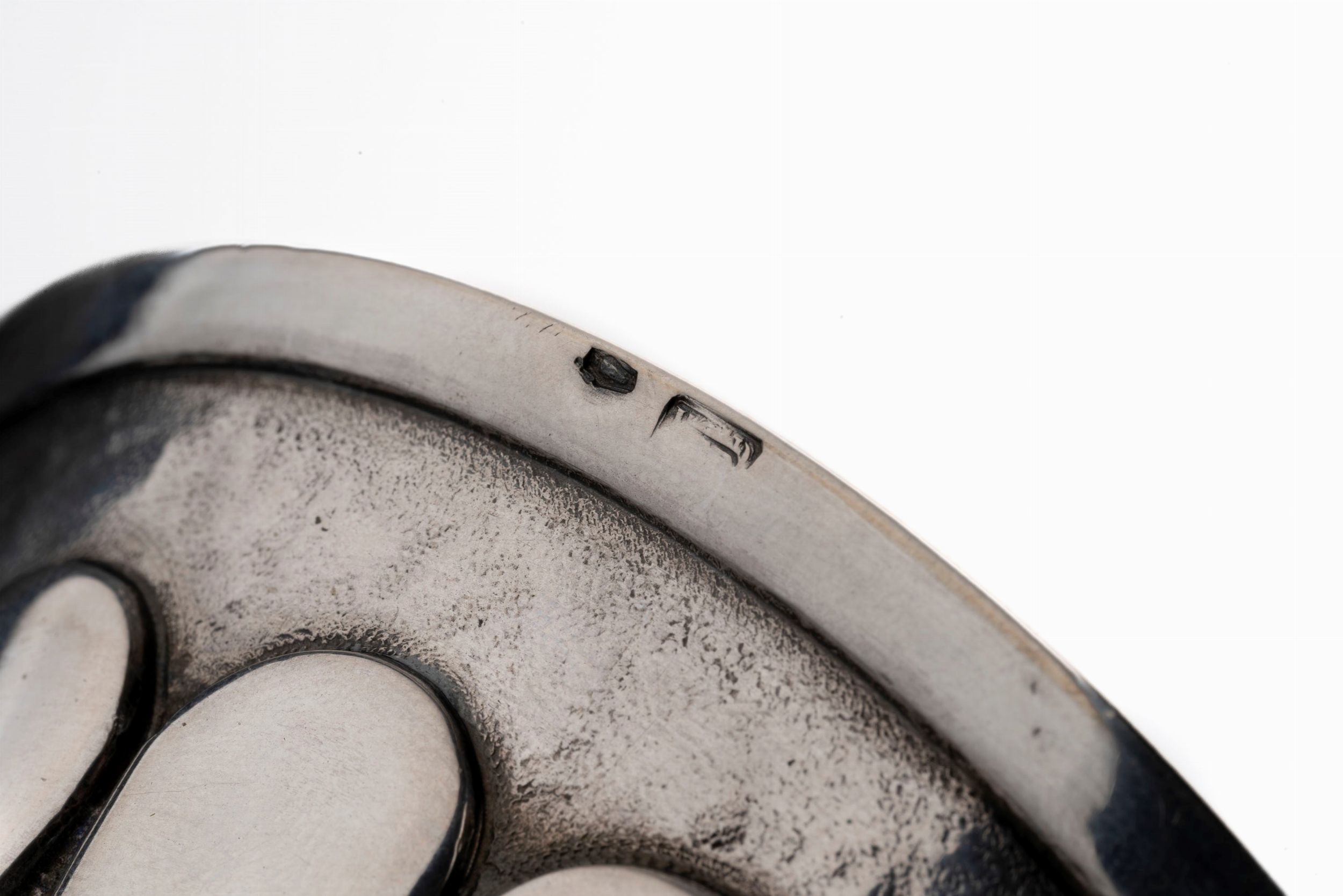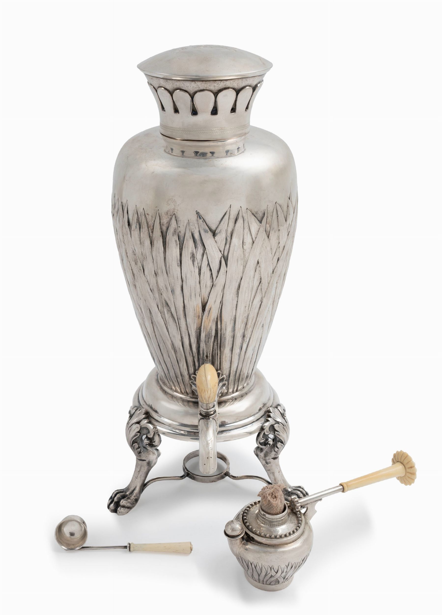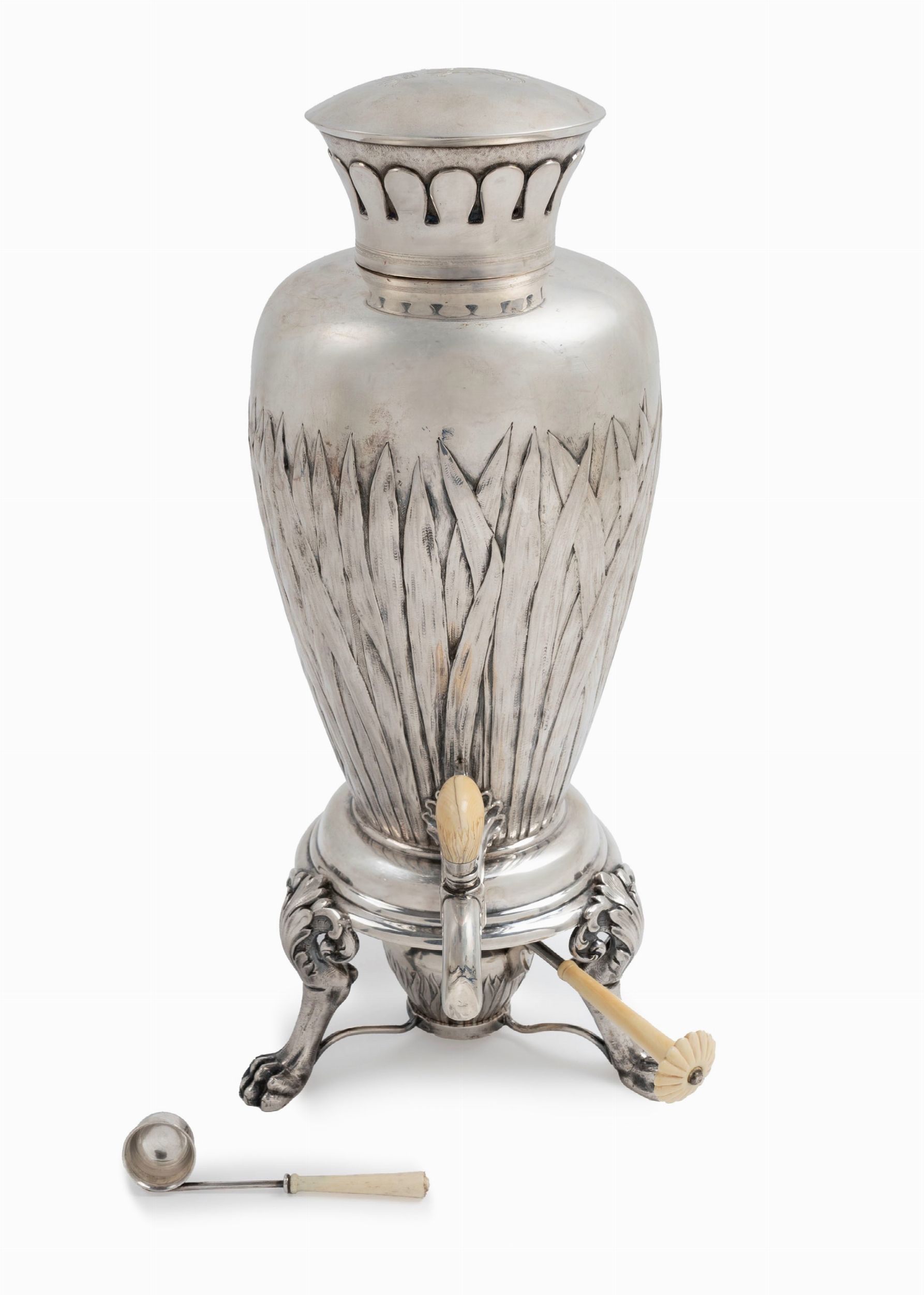 Vienna, XIX-XX secolo poggiante su tre piedini zoomorfi, al centro decoro fogliaceo a rilievo, coperchio con iniziale e corona a sette punte.