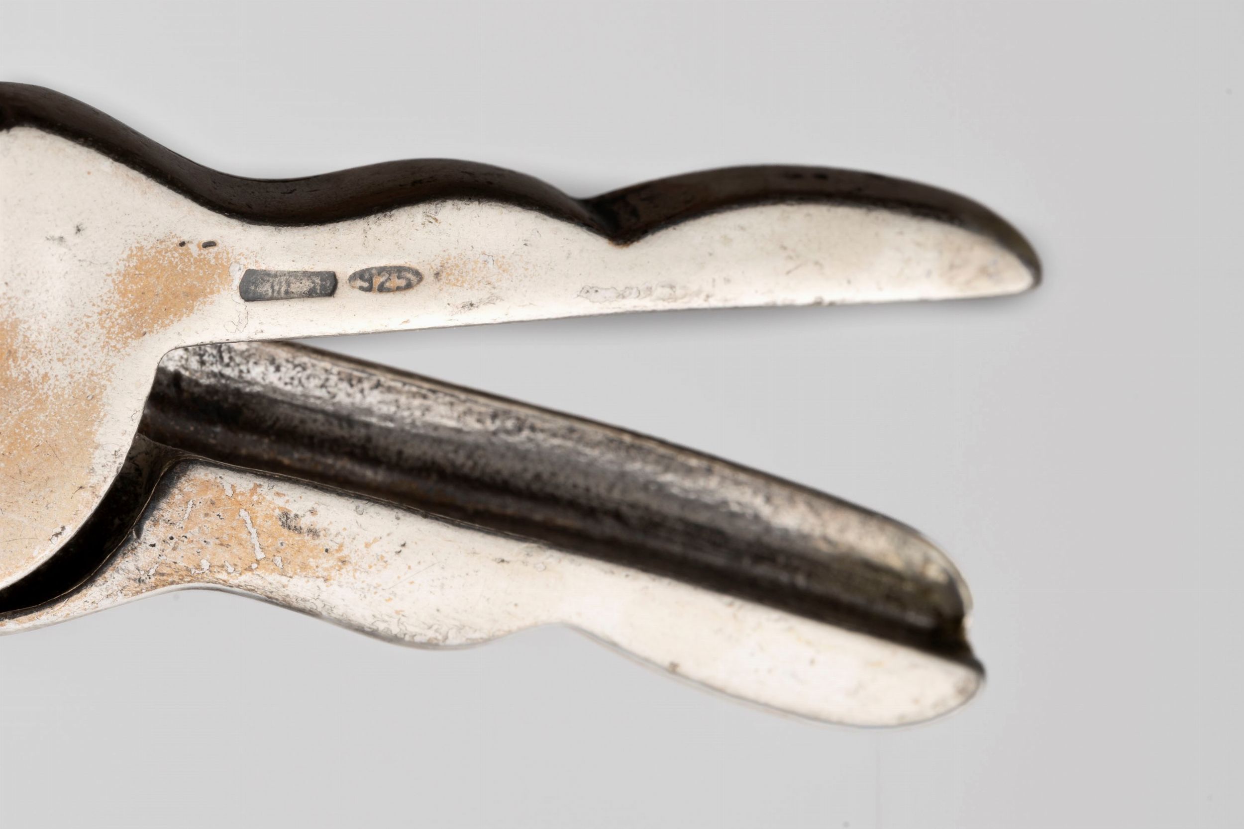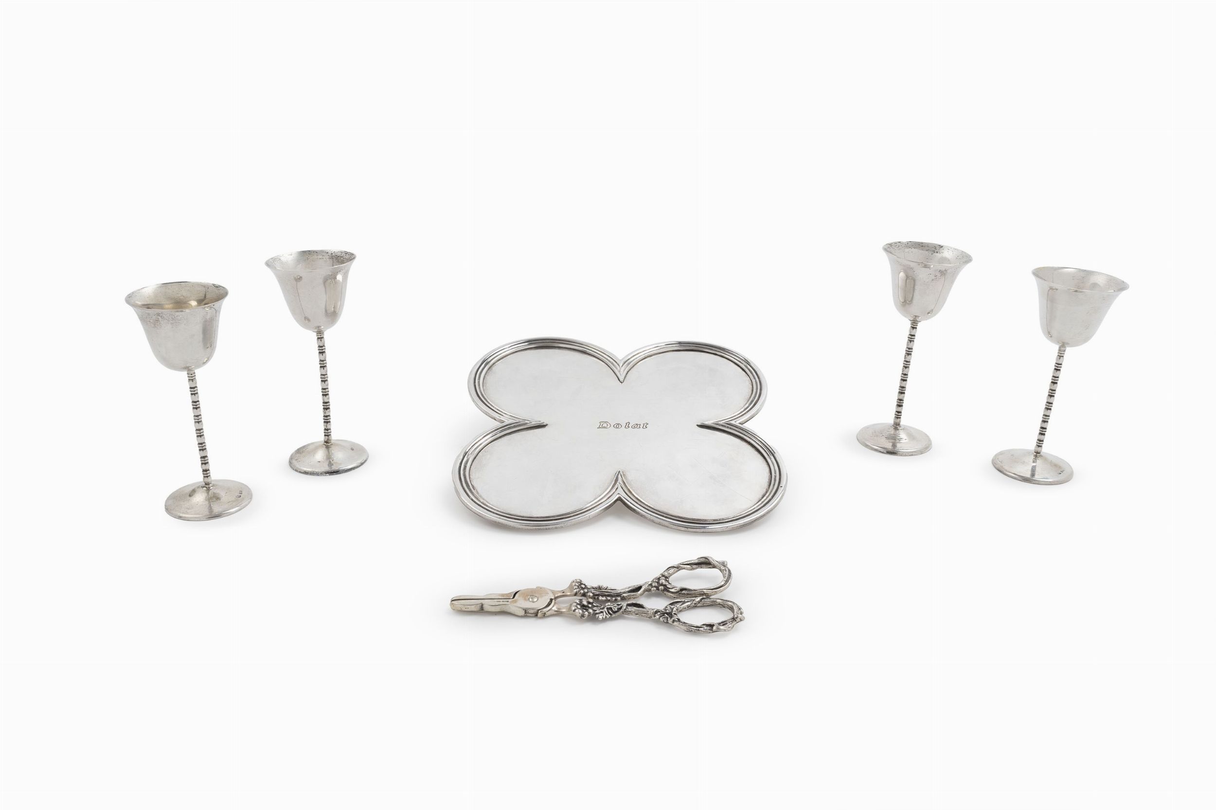 Italia e Germania, seconda metà XIX secolo composti da un vassoio a forma di quadrifoglio con piedini, quattro bicchierini e una forbice da uva con decori a tralci di vite.