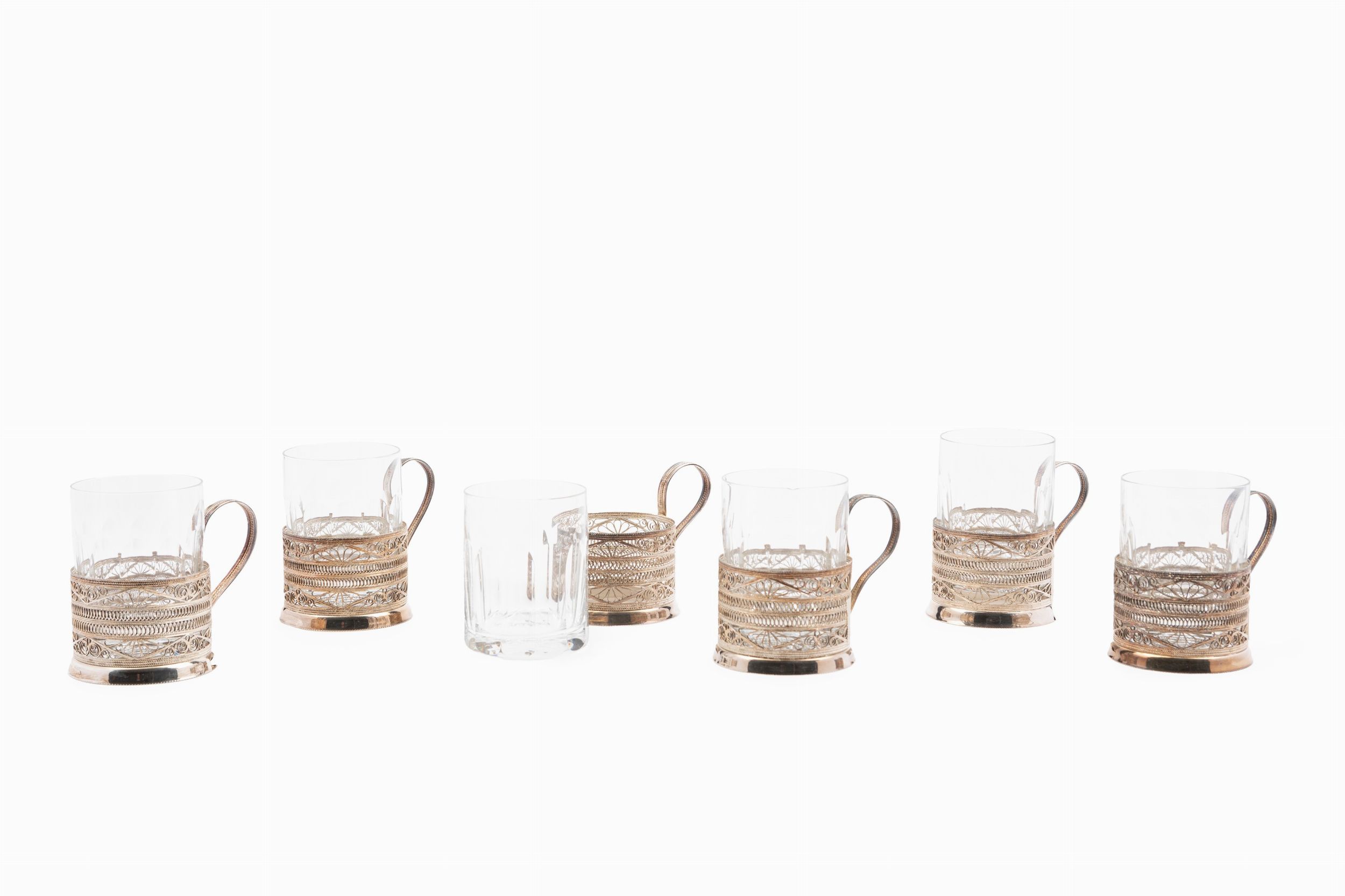 XX secolo in filigrana a decoro traforato, con bicchieri in vetro.