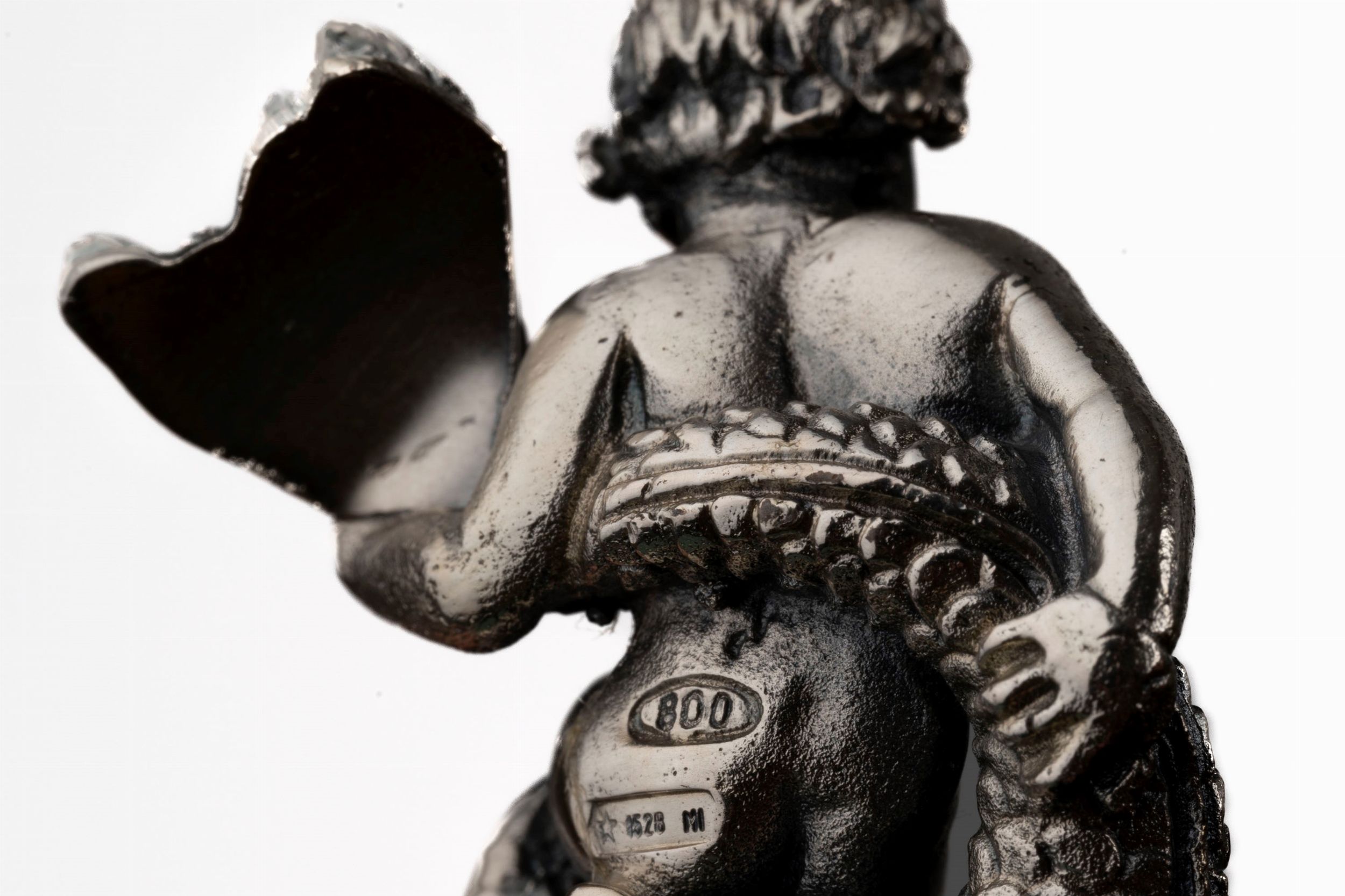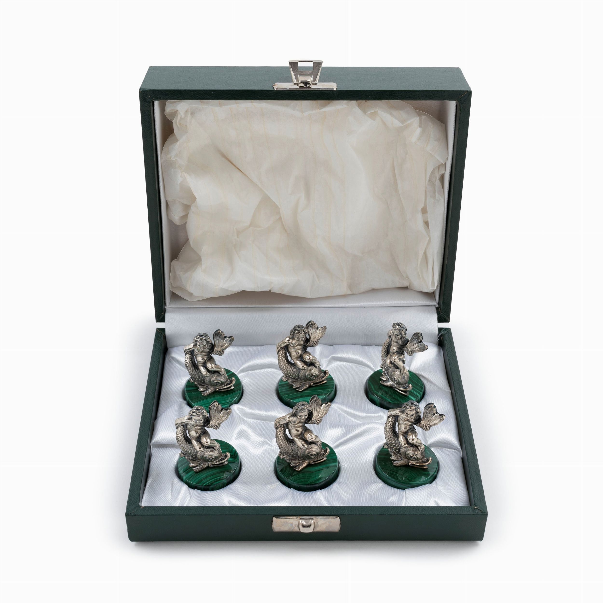 Italia, XX secolo base tonda in malachite sormontata da delfino e putto, con scatola.