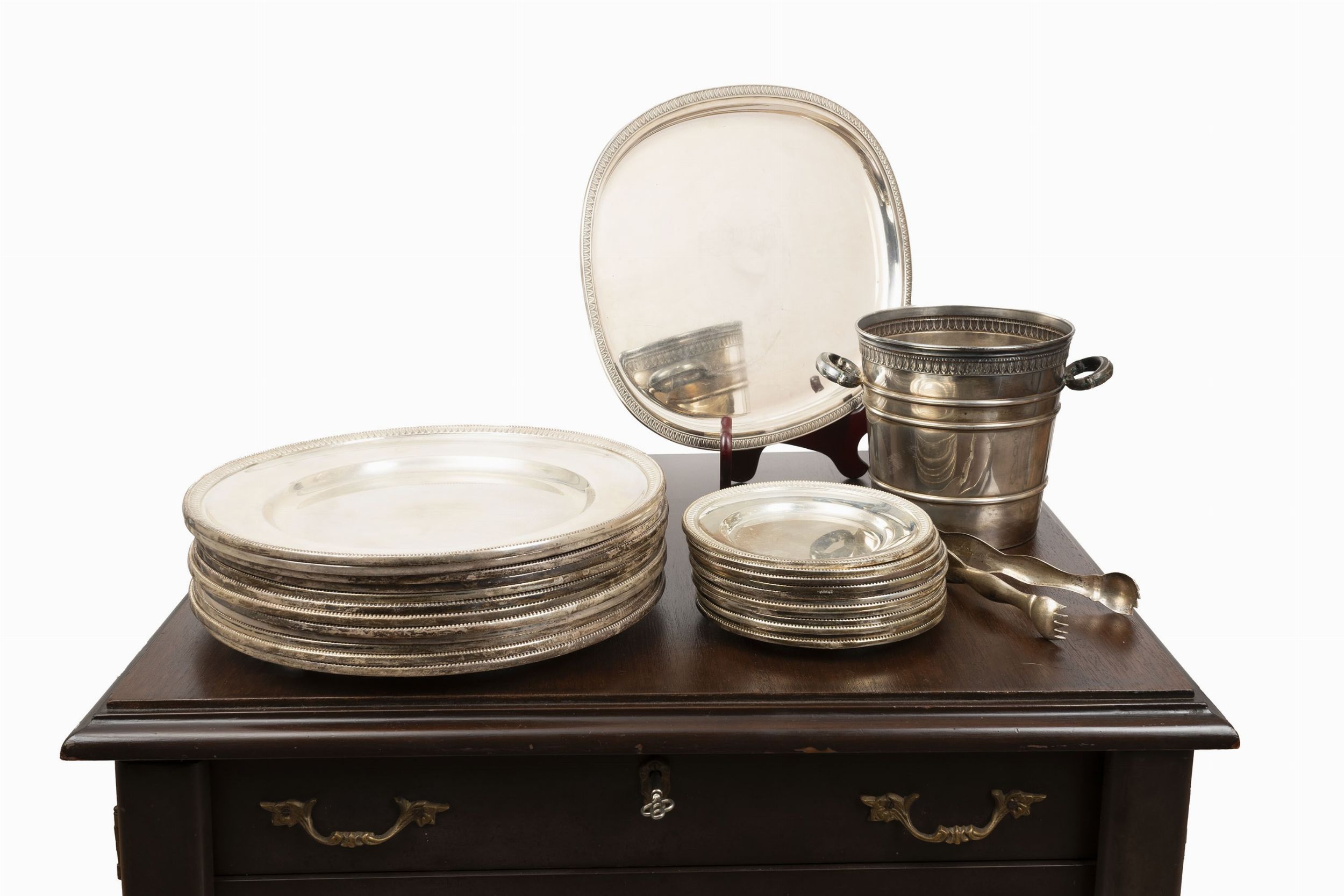 12 sotto piatti (diam.cm 28), 12 piattini pane (diam. cm 15), 1 vassoio ovale (cm 26x36) e 1 porta ghiaccio (diam. cm 15 x h 15) con pinza, a decoro in stile Impero.