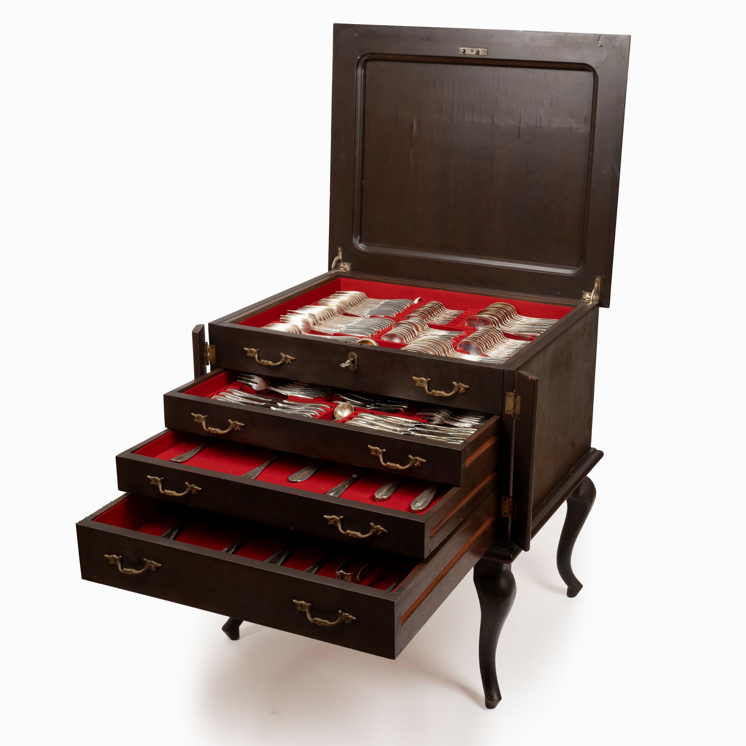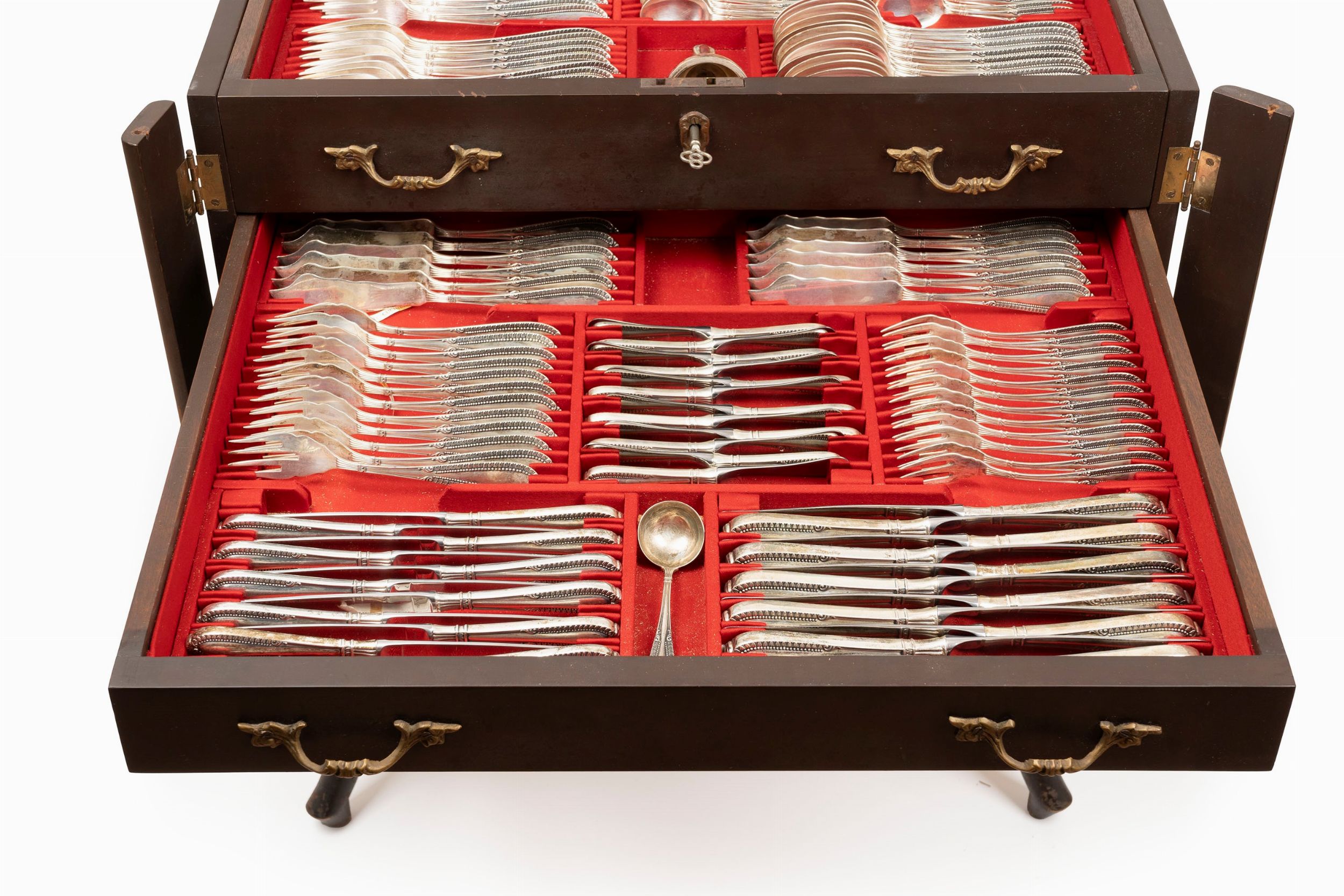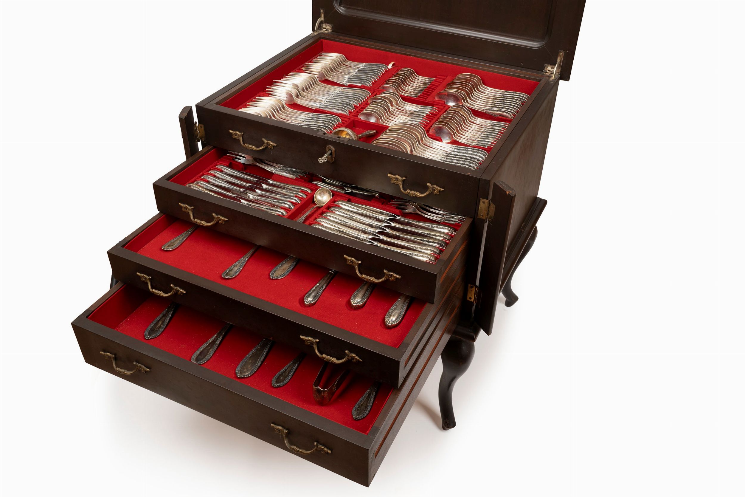 12 cucchiai grandi, 24 forchette grandi, 12 cucchiai medi, 12 forchette medie, 12 cucchiai da gelato, 12 cucchiaini da caffè, 12 cucchiai da dolce, 12 coltelli carne, 12 forchette pesce, 12 coltelli pesce, 12 coltelli da burro, 12 coltelli grandi, 16 serviti, 1 campanella, con mobiletto in legno;
