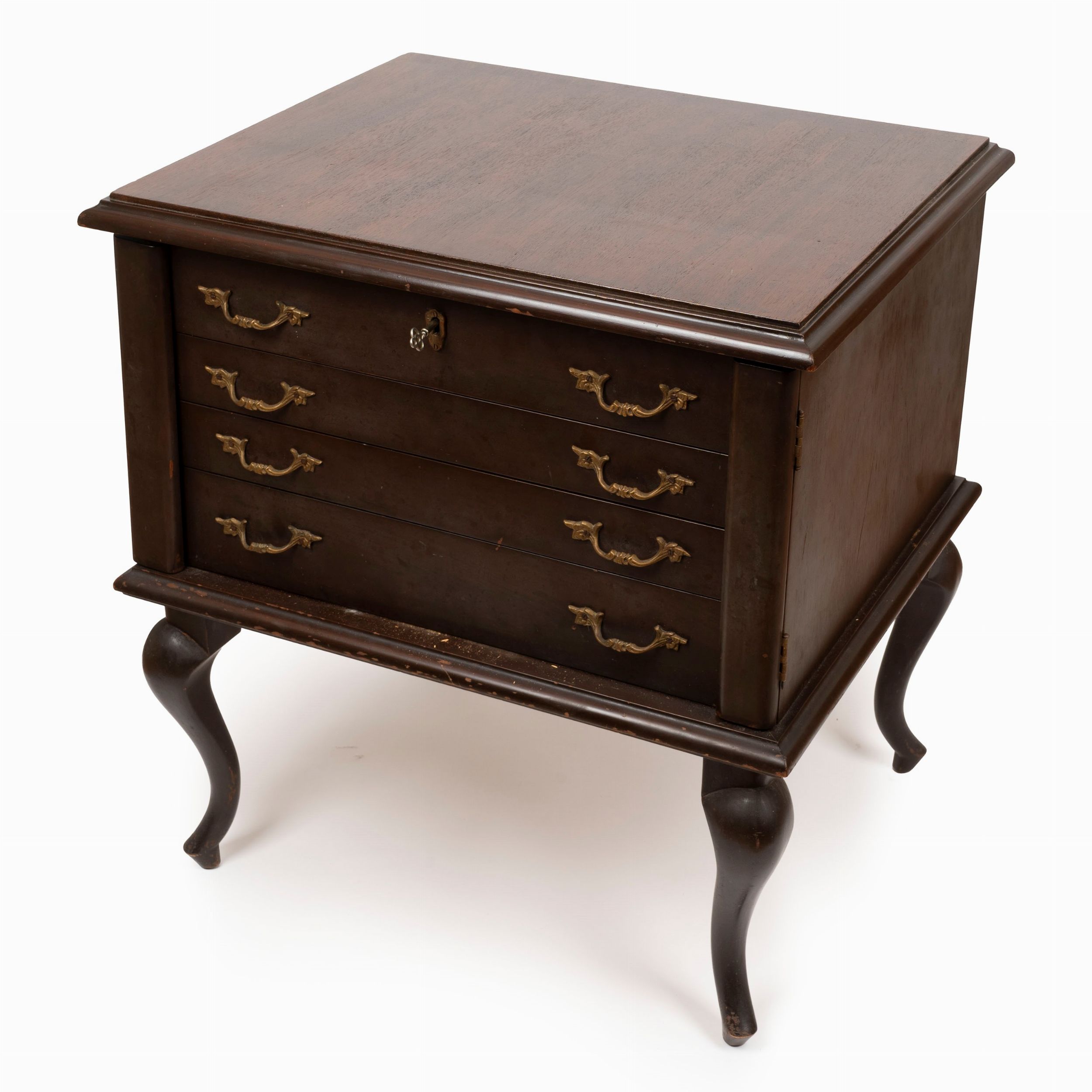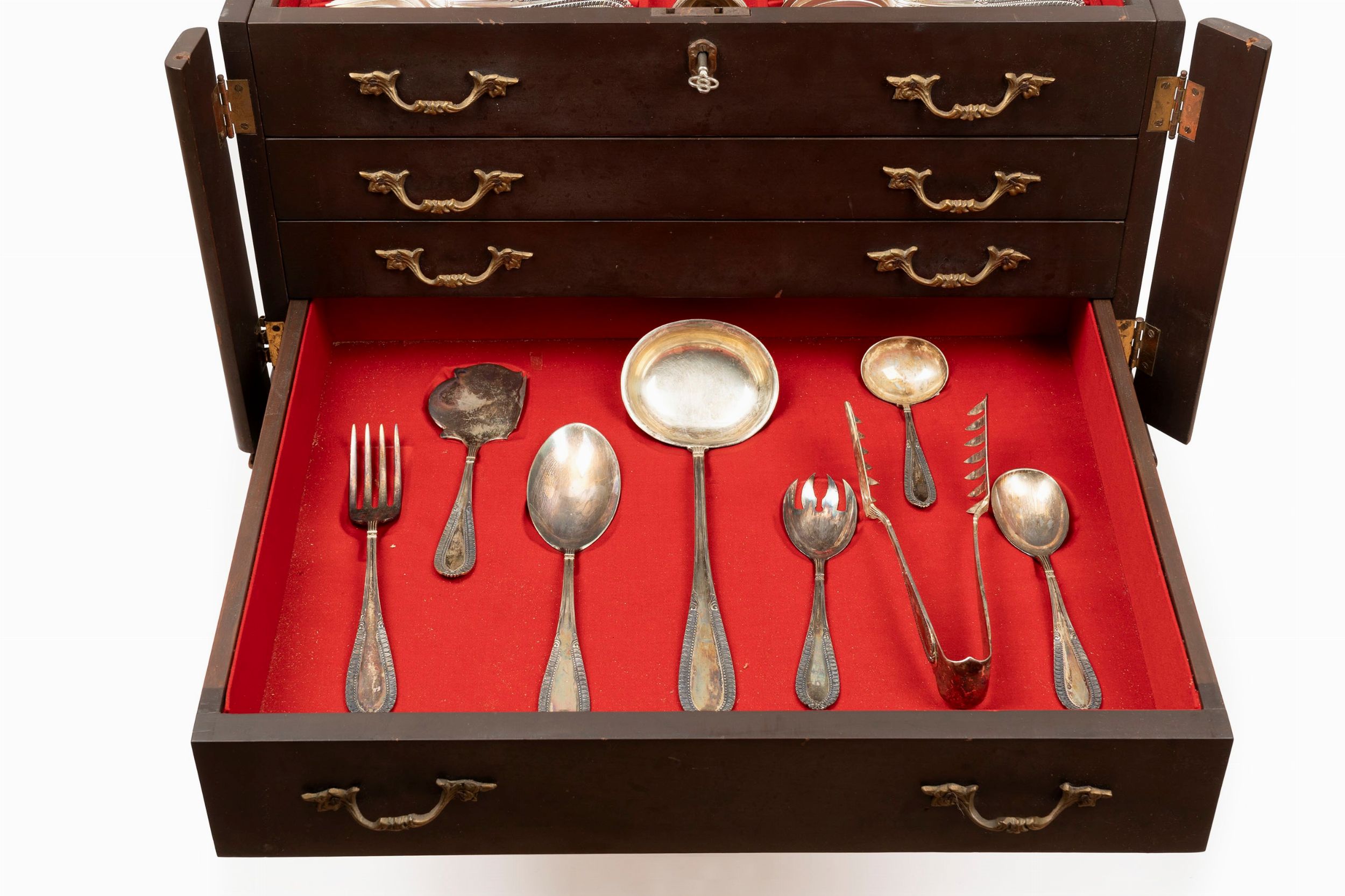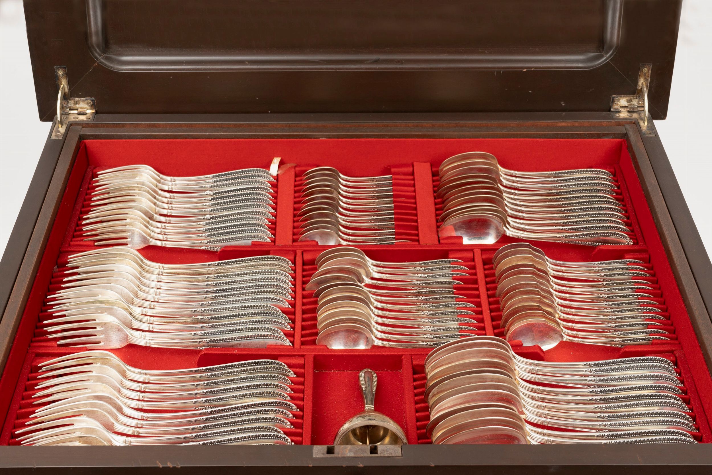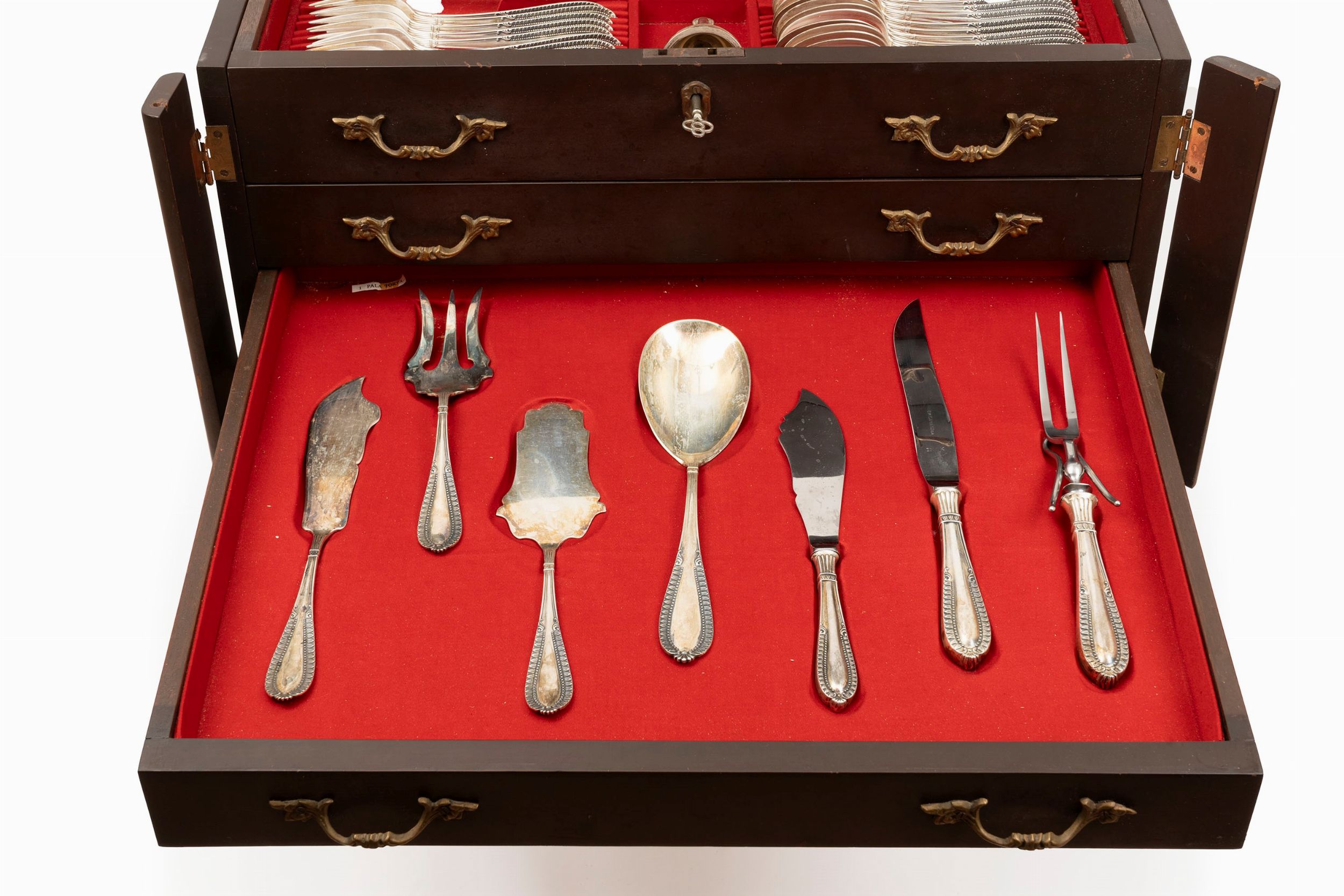 12 cucchiai grandi, 24 forchette grandi, 12 cucchiai medi, 12 forchette medie, 12 cucchiai da gelato, 12 cucchiaini da caffè, 12 cucchiai da dolce, 12 coltelli carne, 12 forchette pesce, 12 coltelli pesce, 12 coltelli da burro, 12 coltelli grandi, 16 serviti, 1 campanella, con mobiletto in legno;
