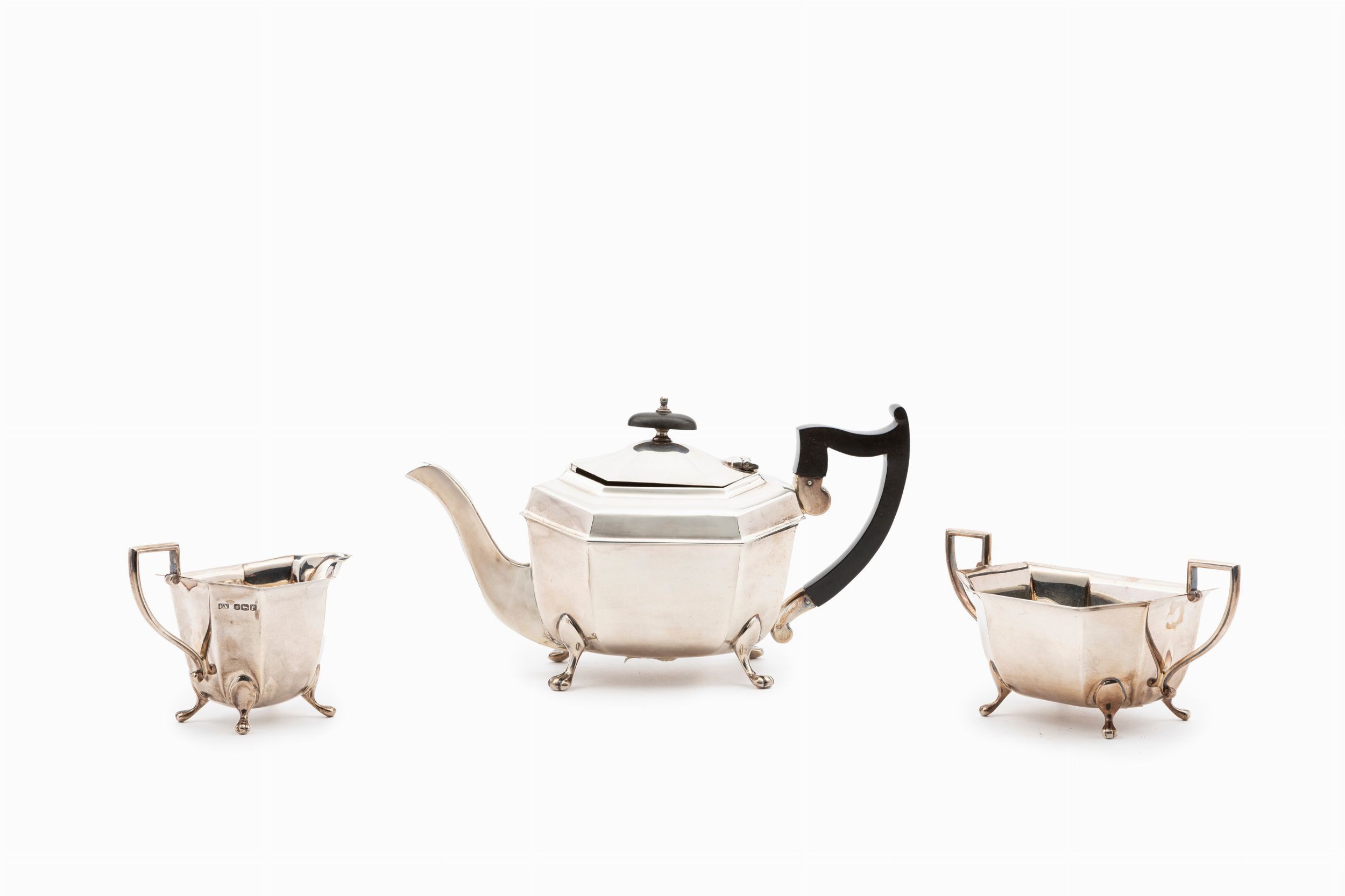 Inghilterra, città di Sheffield, 1932 composto da teiera, lattiera e zuccheriera, con manico e presa in legno.