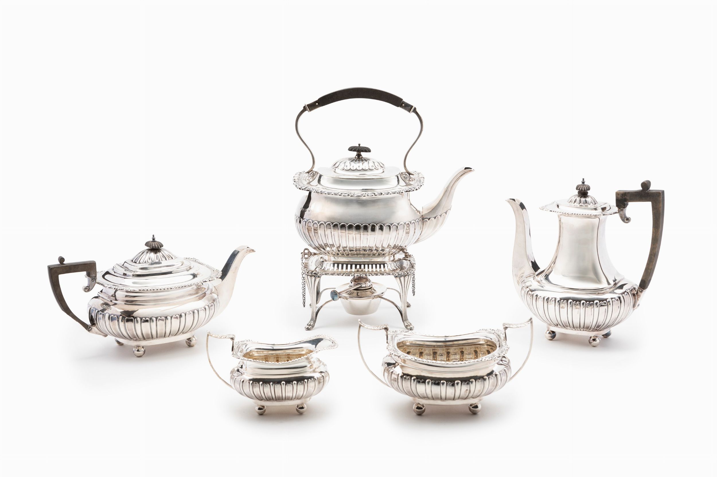 Inghilterra, Sheffield, inizi XX secolo composto da samovar con manico reclinabile (cm h 26,00), caffettiera, teiera, lattiera e zuccheriera, con manici e prese in legno, autore Kettll.