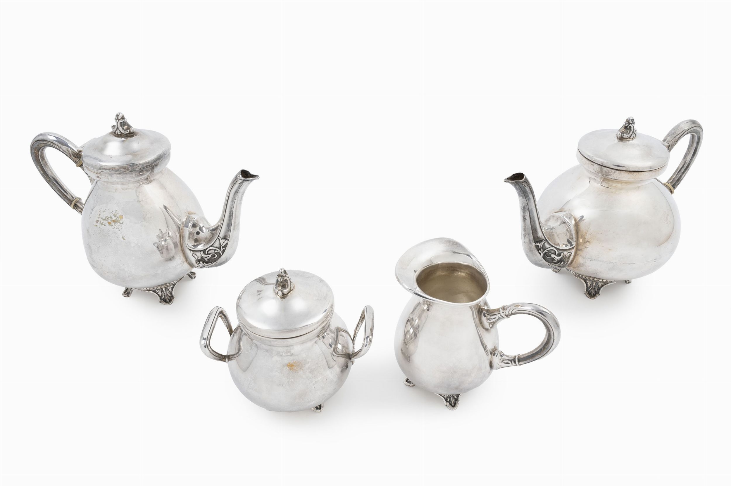 Italia, XX secolo composto da caffettiera, teiera, zuccheriera e lattiera, poggianti su quattro piedini, con decori floreali.