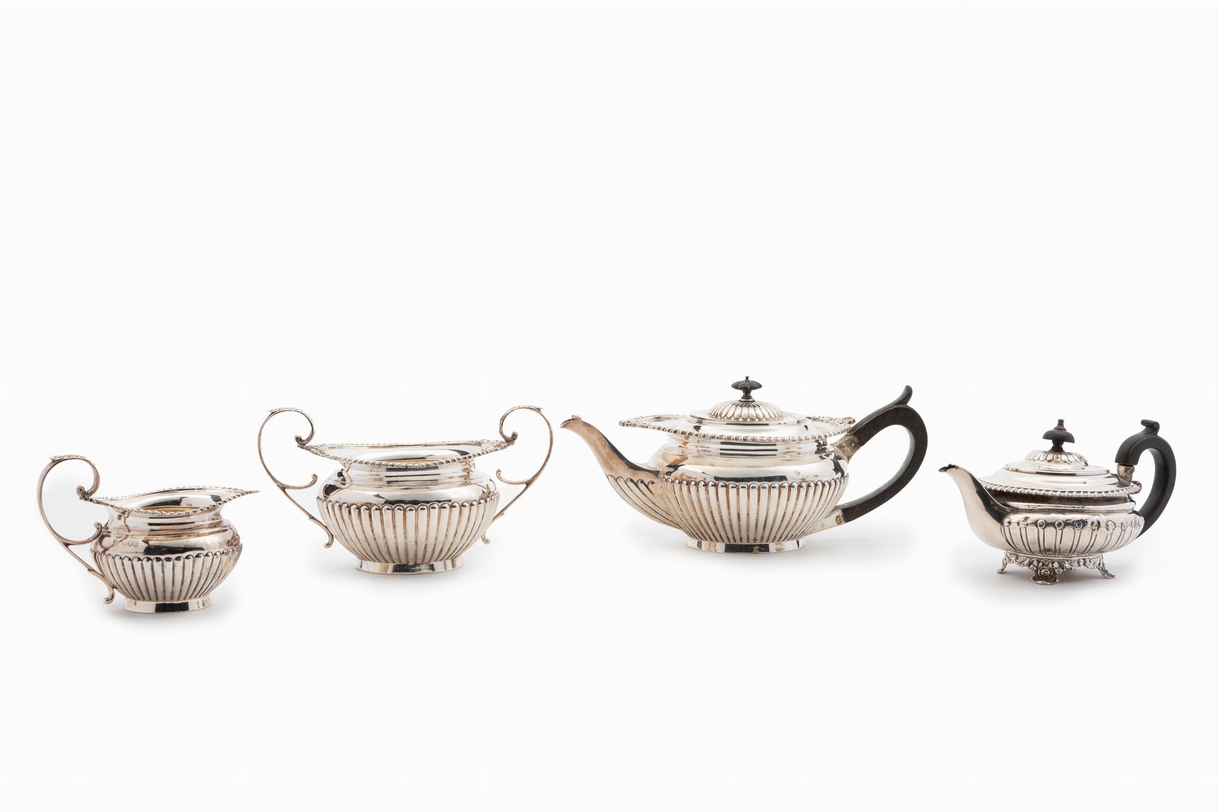 Inghilterra, Londra, inizi XX secolo due teiere di misure diverse con manico e presa in legno, zuccheriera e lattiera con manici a ricciolo, corpo lavorato a sbalzo.