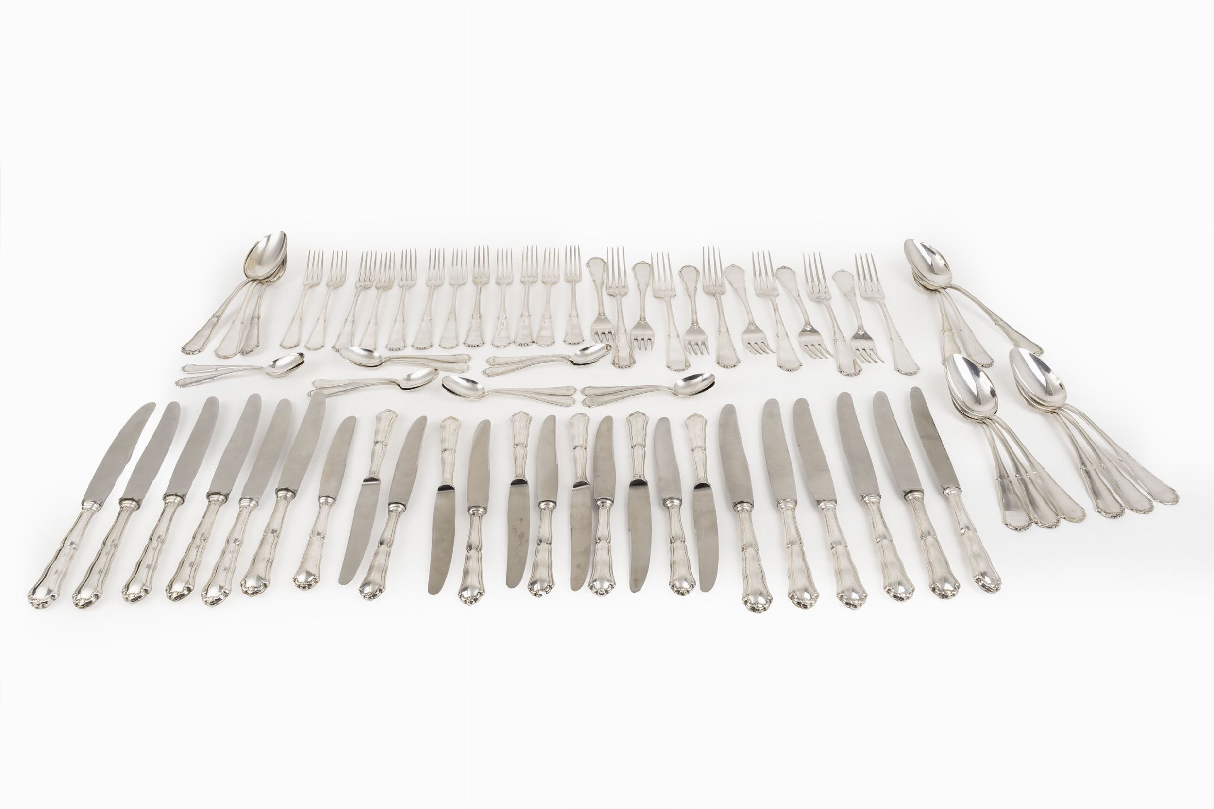 Italia, XX secolo composto da 12 forchette grandi, 12 cucchiai grandi, 12 coltelli grandi, 12 forchette medie, 12 coltelli medi e 12 cucchiaini.