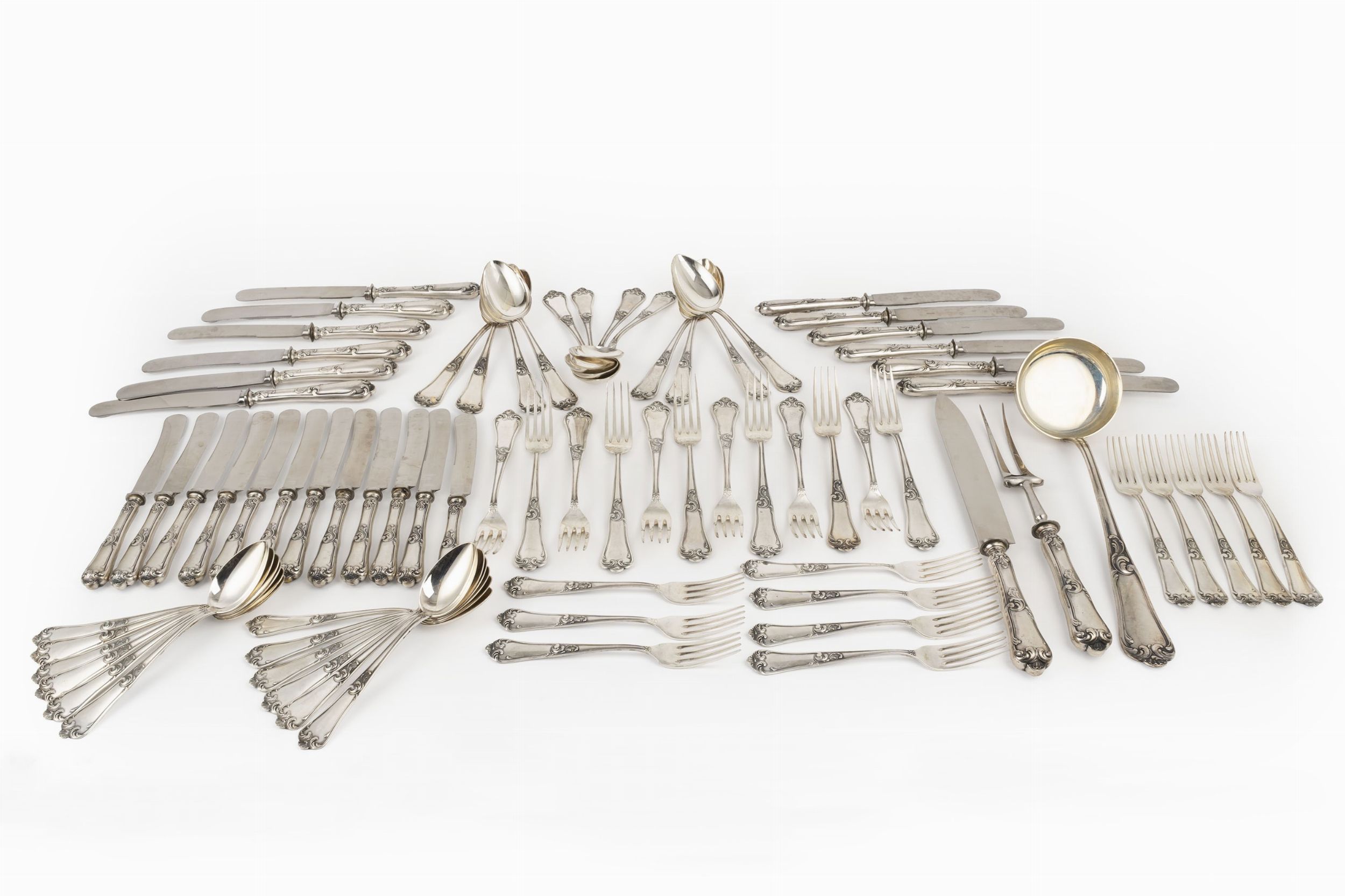 XX secolo composto da 12 forchette grandi, 12 forchette medie, 12 cucchiai grandi, 12 cucchiai medi, 12 coltelli grandi, 12 coltelli medi e 3 serviti.