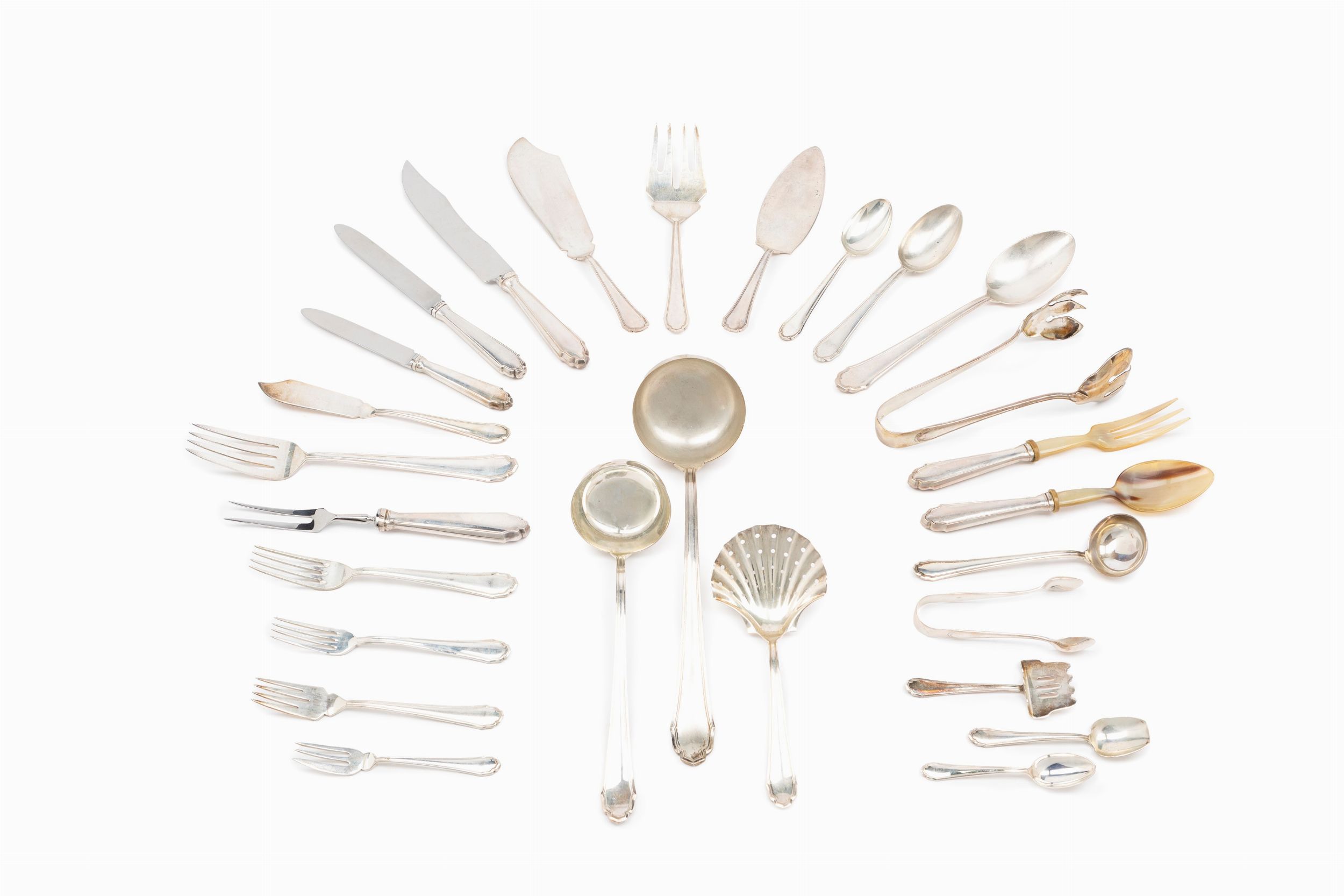 composto da 114 pezzi: 6 coltelli, 12 forchette, 12 coltelli da frutta, 12 forchette da frutta, 6 coltelli da pesce, 6 forchette da pesce, 6 cucchiai, 12 forchette da dolce, 12 cucchiai da frutta, 12 cucchiaini da tè, 18 serviti.
