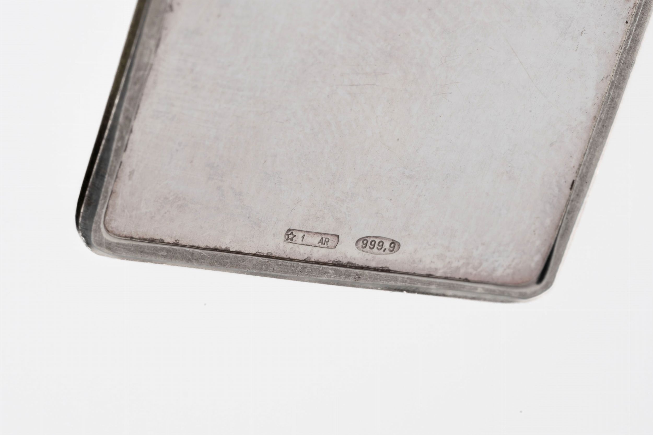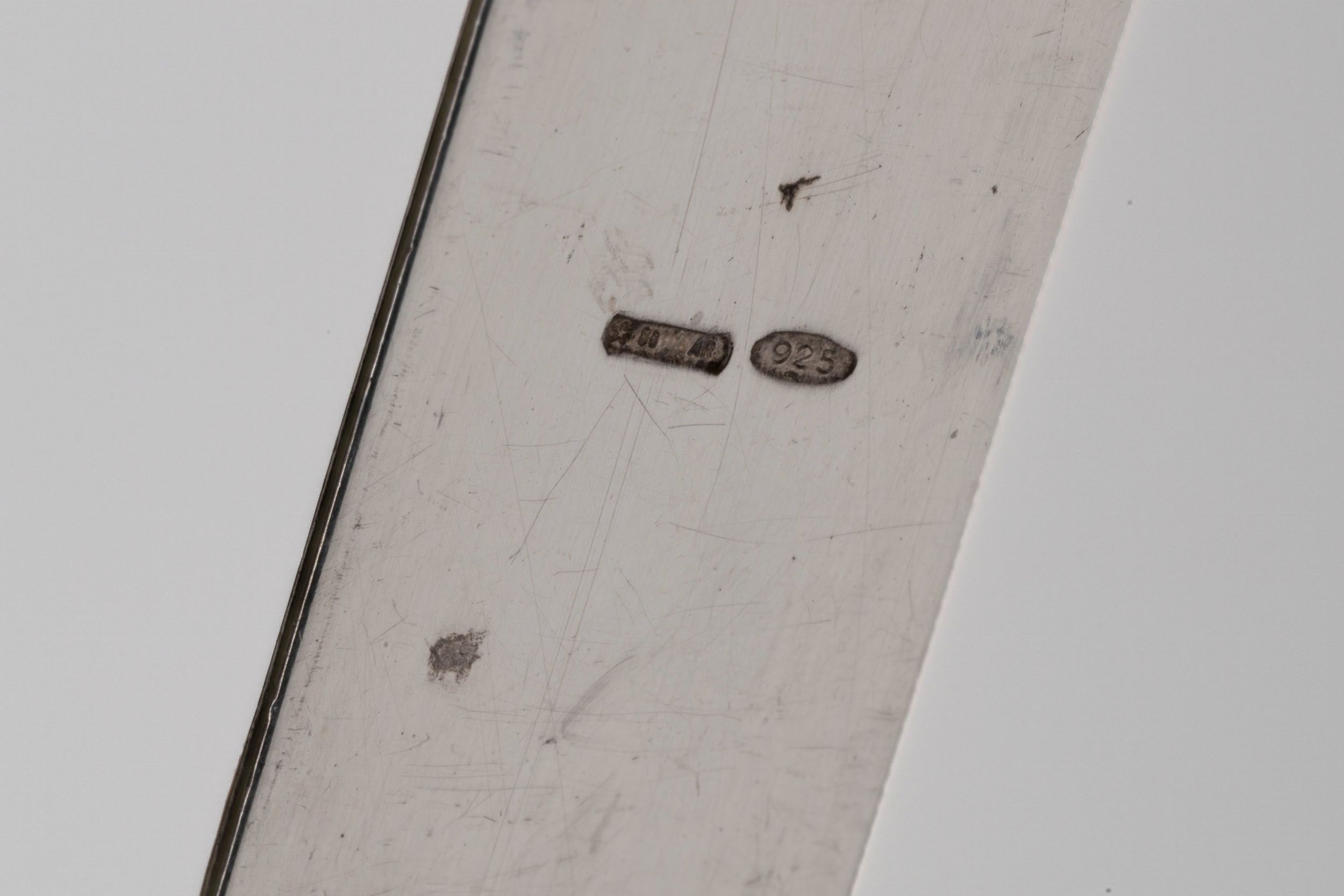 Italia, XX secolo composto da portapenne, tagliacarte in argento 925, lingottino con Dea della Fortuna in argento 999,99, posacenere con inciso Banco di Santo Spirito e porta carte a forma di attache con iniziali.