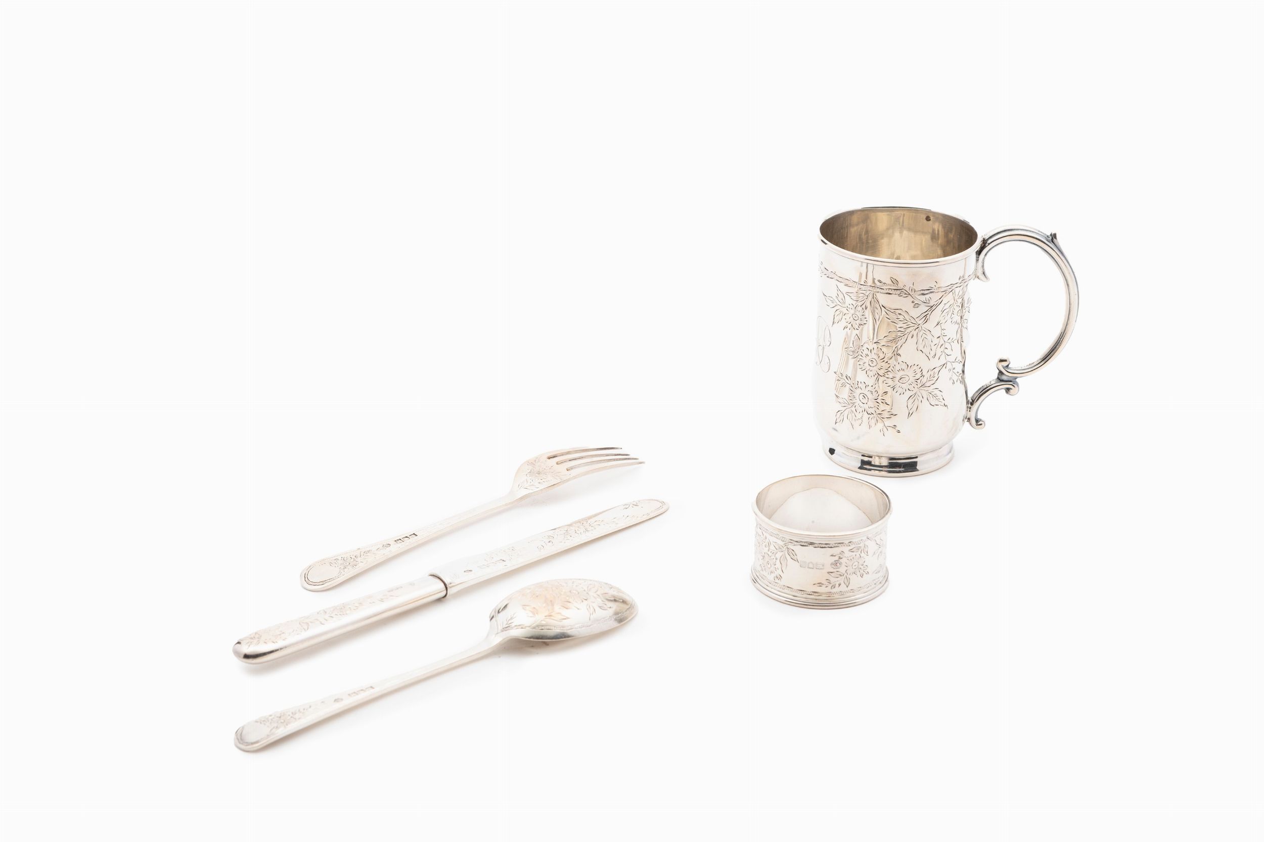 Inghilterra, Birmingham, inizi XX secolo coltello, forchetta e cucchiaio tavola con lega tovagliolo e boccale, con incisioni floreali, con scatola originale (cm. 22x22).