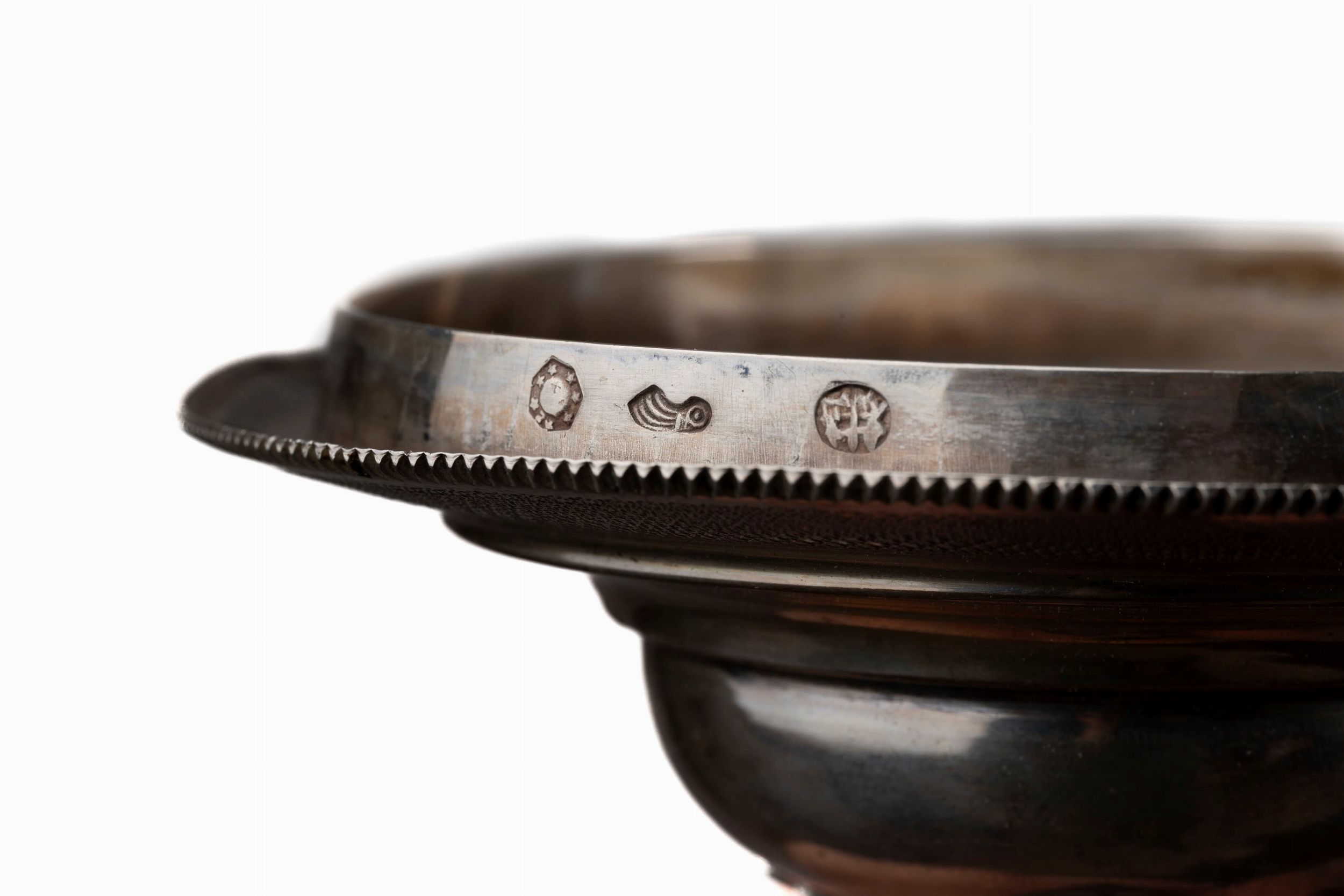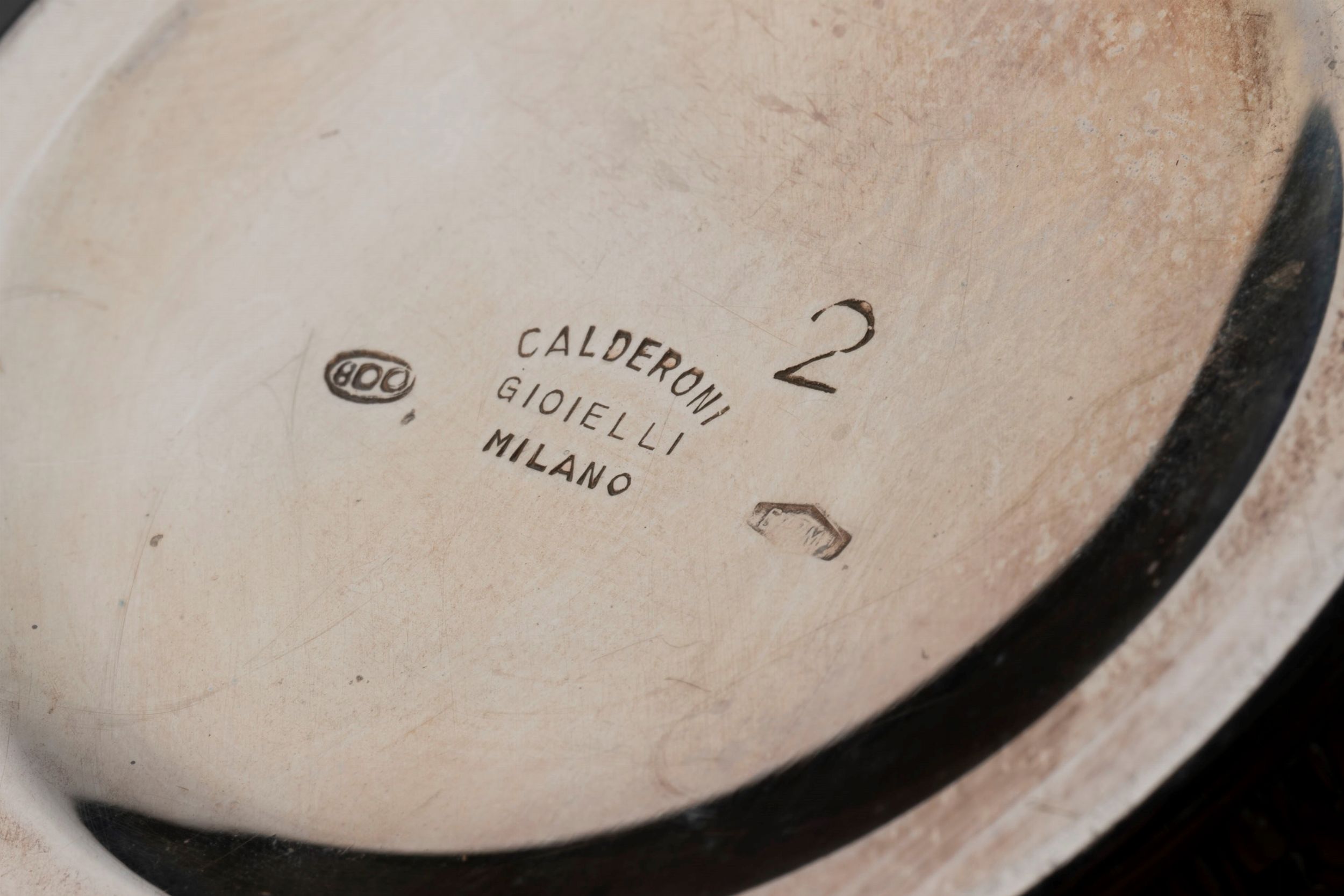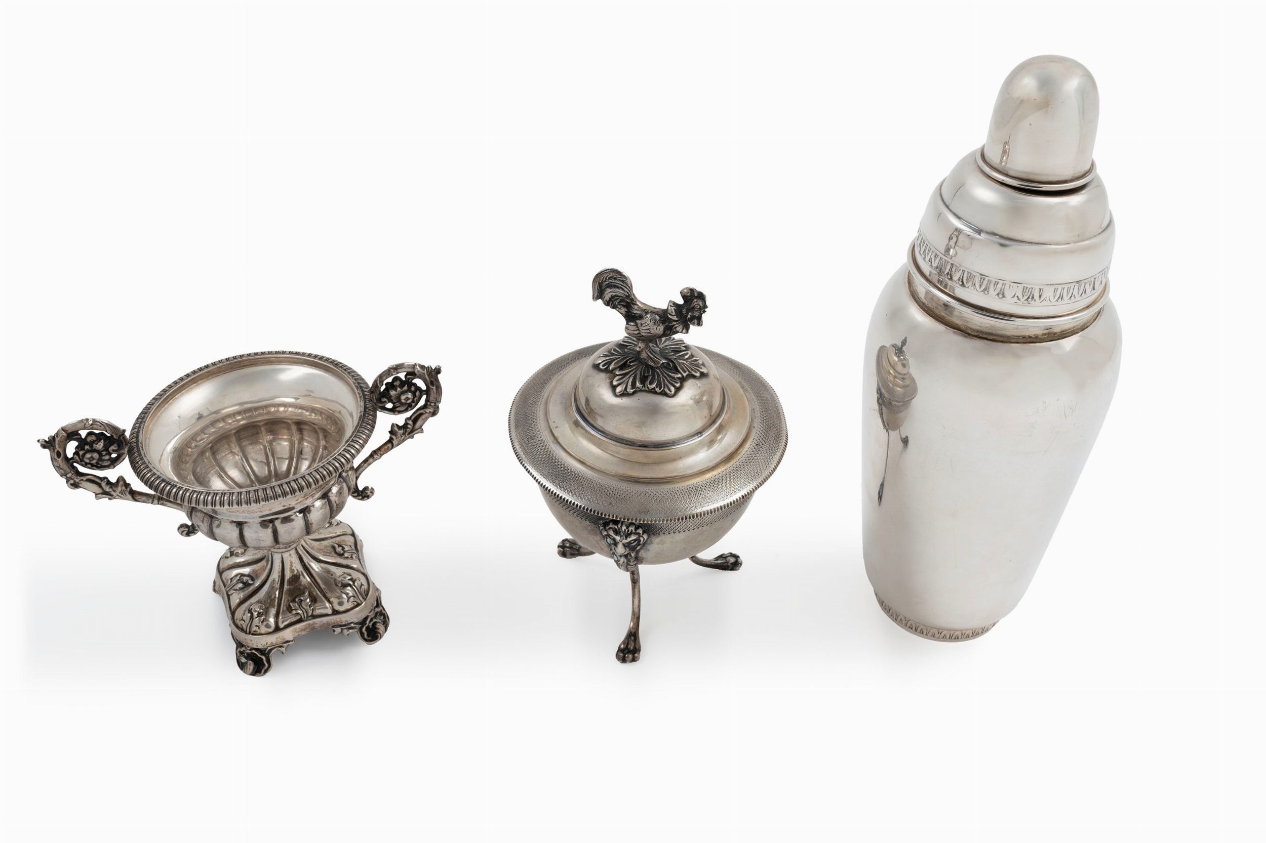 XIX/XX secolo shaker firmato Calderoni, a corpo liscio con decori in stile impero, coppa poggiante su quattro piedini a conchiglia e decori a foglia, fusto baccellato e prese a ricciolo, zuccheriera poggiante su tre piedini zoomorfi con decori a bulino e presa a gallo.