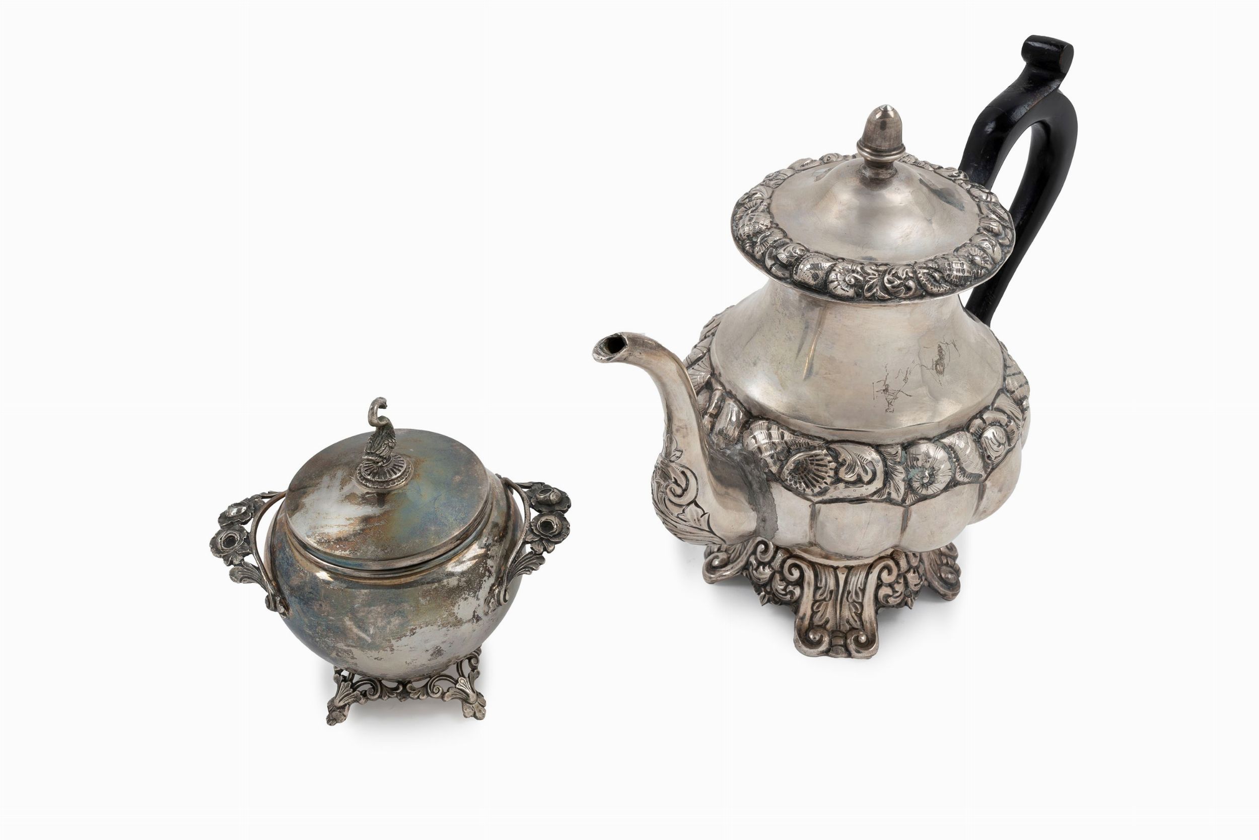 Italia, XIX secolo teiera poggiante su quattro piedini a volute, fusto scanalato con decoro sbalzato a fiori e conchiglie, presa a pigna, zuccheriera su quattro piedini e presa a cigno.