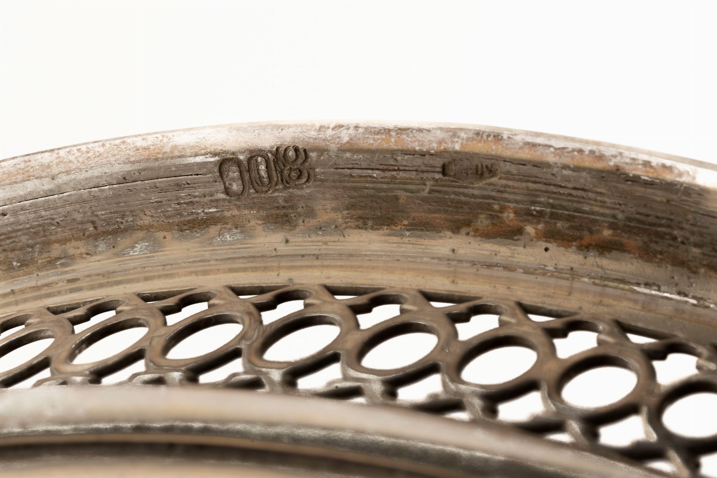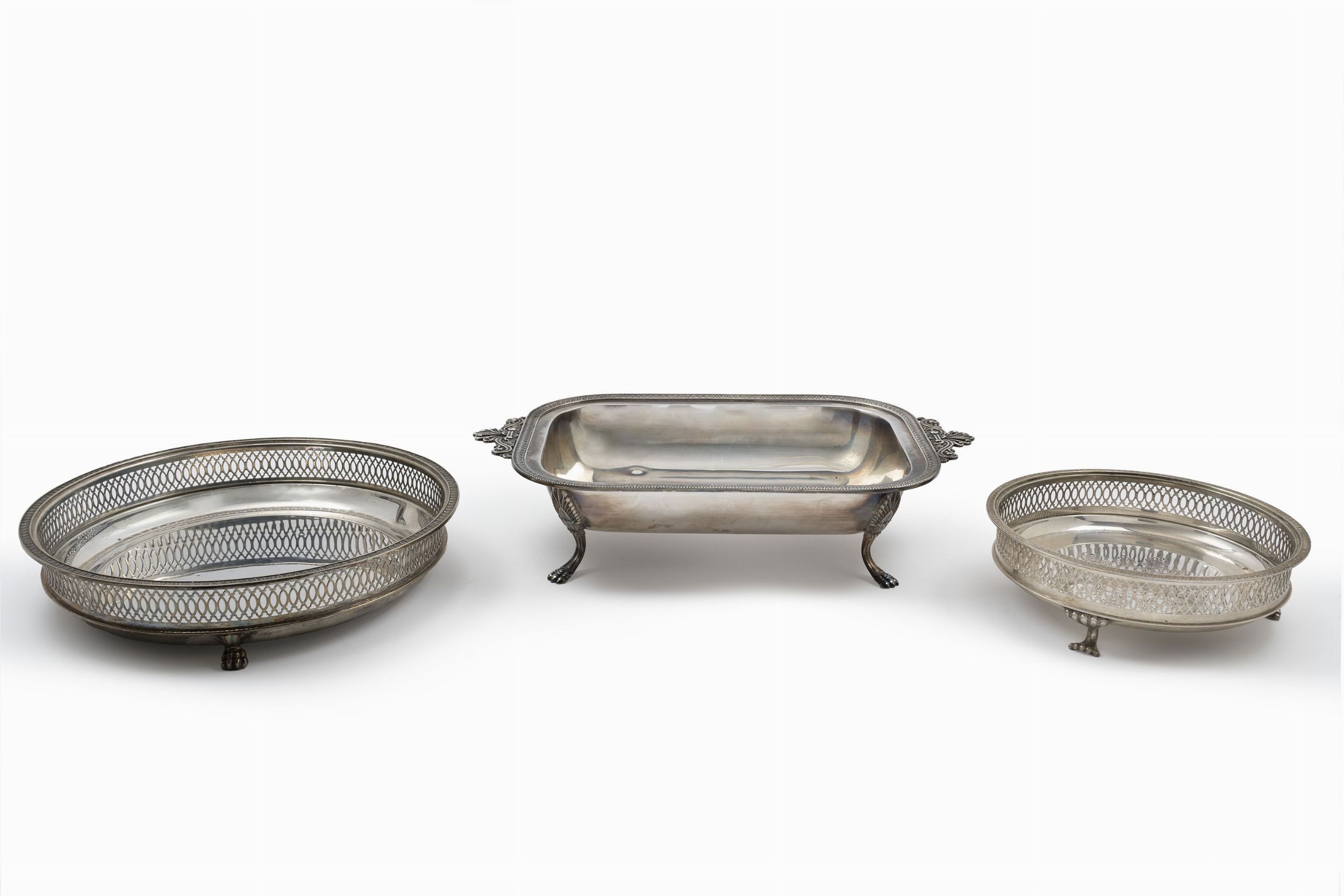 Italia, XX secolo poggianti su piedini zoomorfi, una rettangolare con decoro in stile Impero e due rotonde con bordo traforato, difetti (lievi ammaccature).