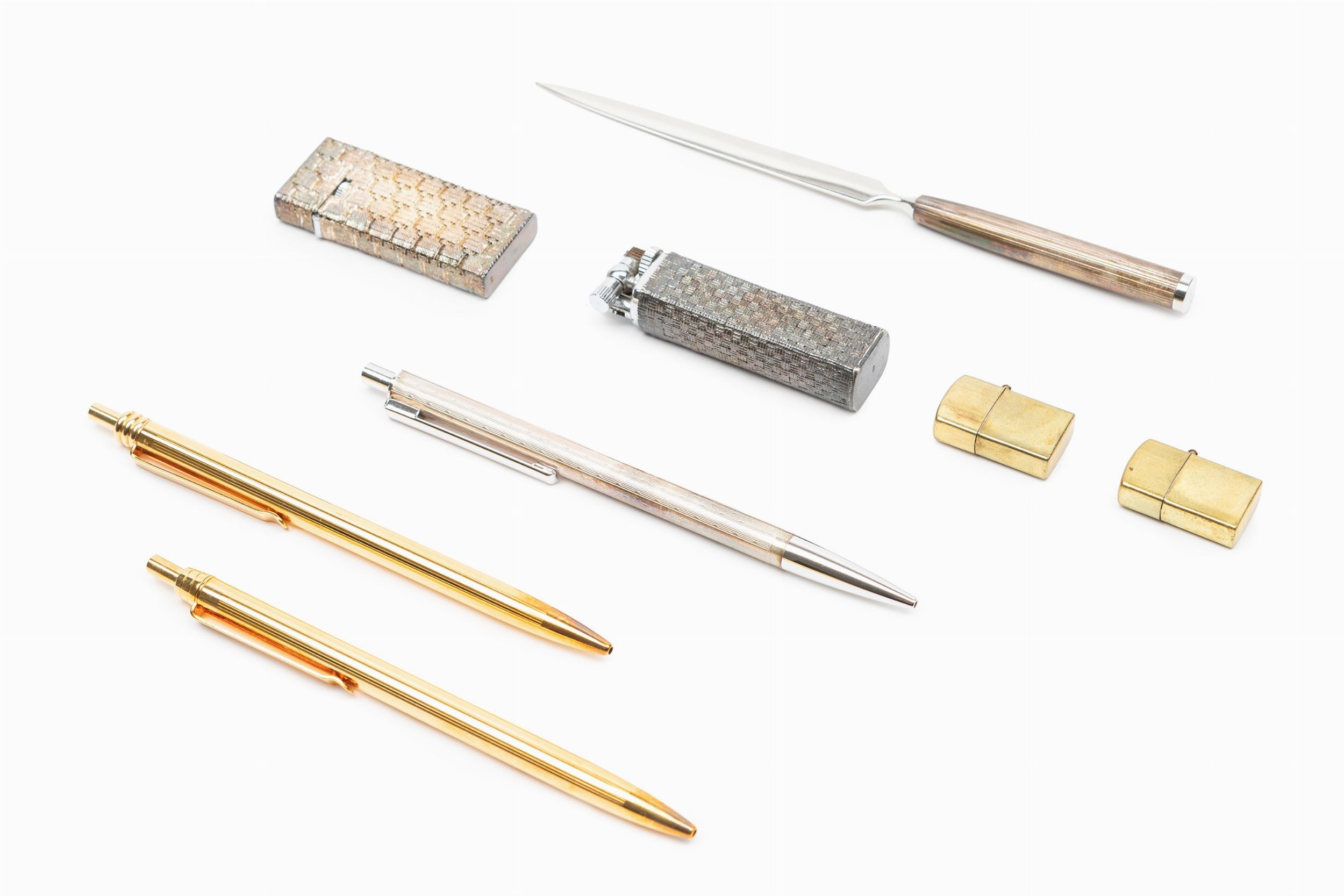 in argento, Peso lordo g 169,60 (comprensivo degli inserti non in argento) Italia, XX secolo due penne Lalex placcate in oro giallo 24k, una penna in argento 925, due accendini, uno con custodia in argento 800 l'altro con custodia in argento 925, un tagliacarte con manico in argento 925.