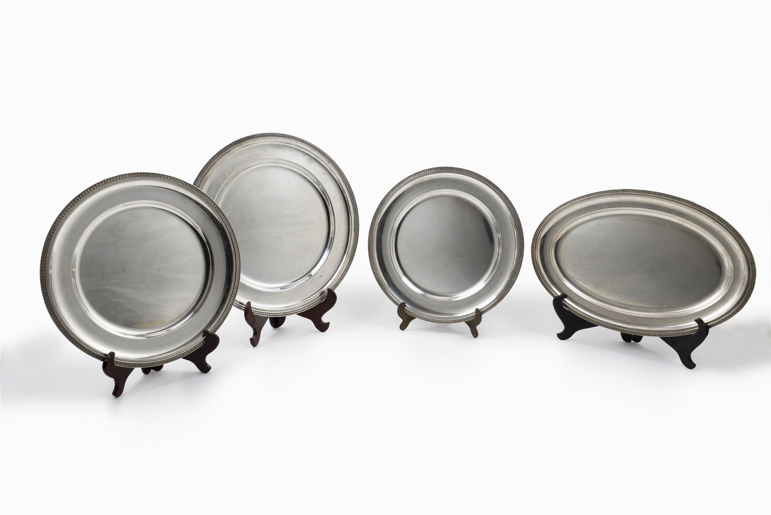 Italia, XX secolo piatti di forma rotonda e vassoio ovale, profili in stile Impero.