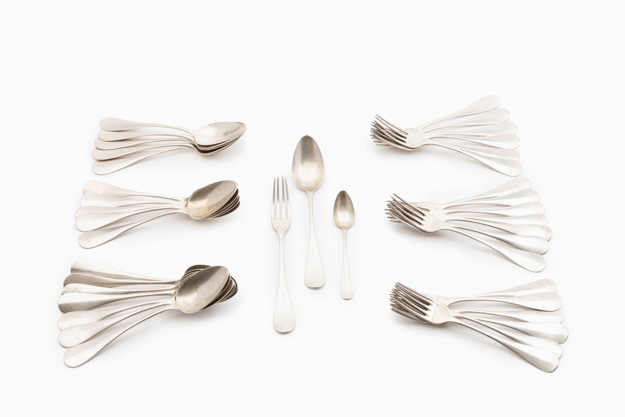 XX secolo composto da diciotto cucchiai, venti forchette e un cucchiaino, con iniziali incise.