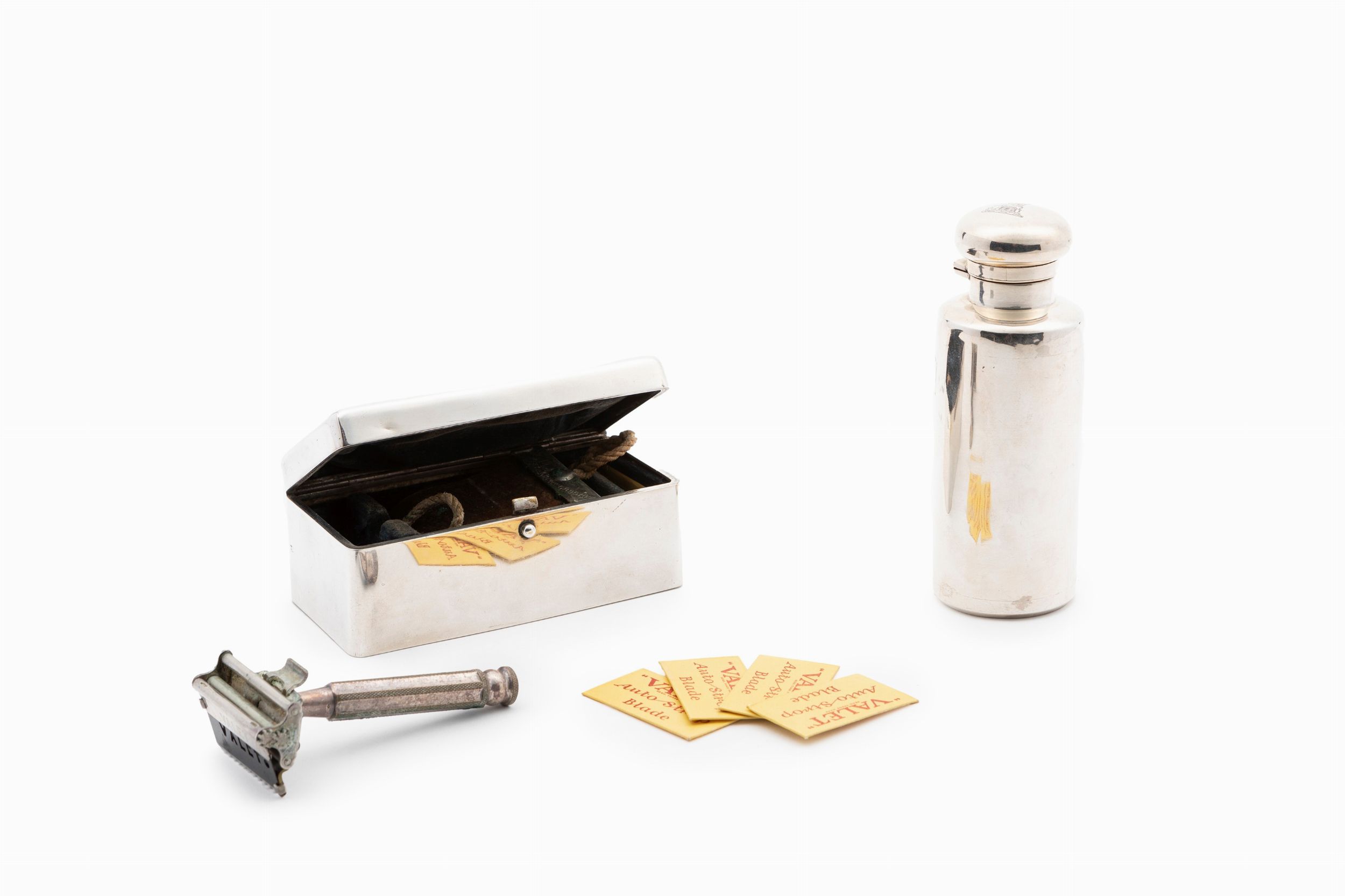 Inghilterra, inizi XX secolo scatola rettangolare contenente porta rasoio e lamette e boccetta di forma cilindrica.
