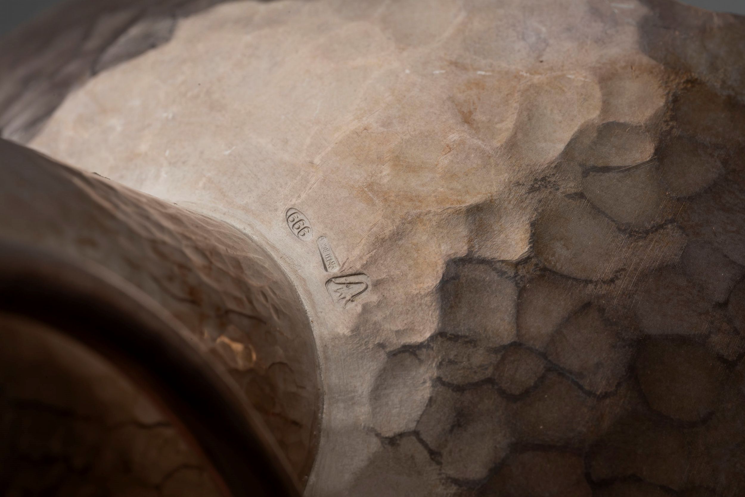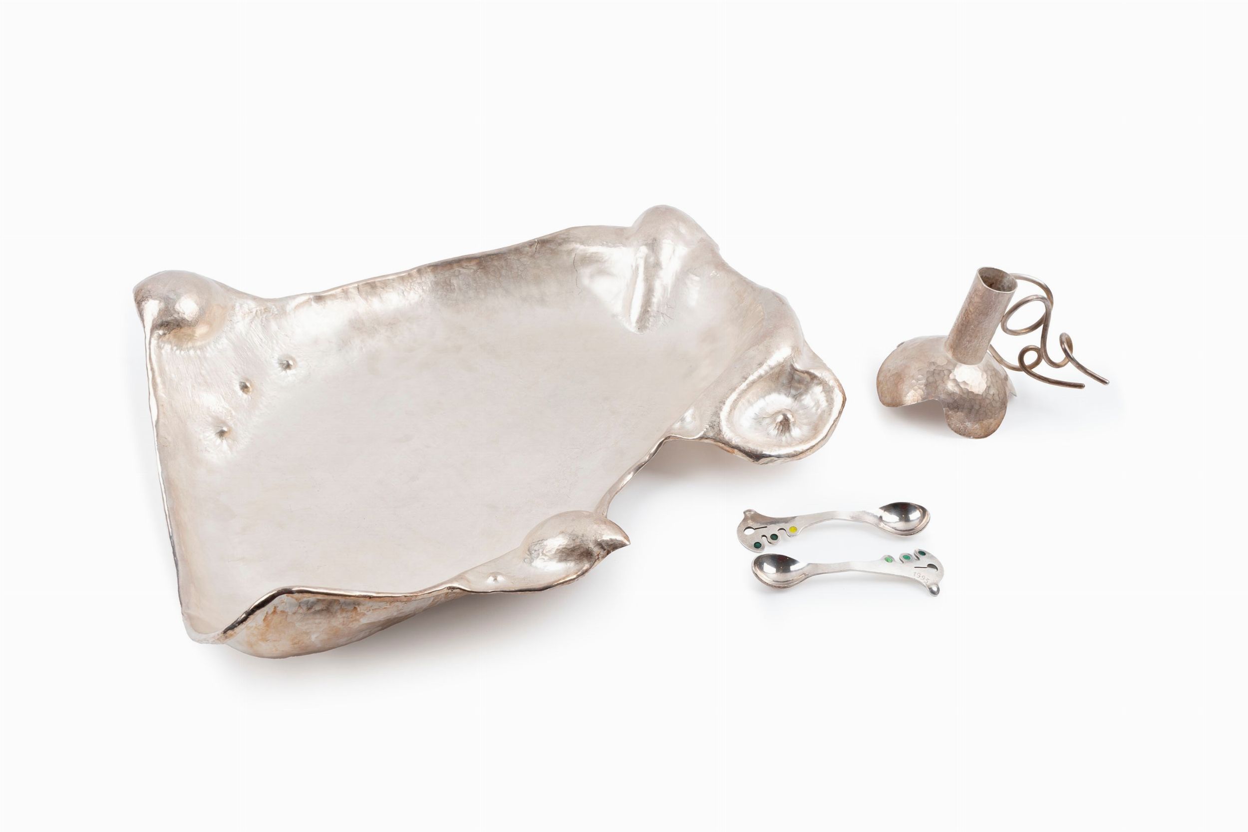 Italia, XX secolo vassoio con decori a sbalzo datato 1997, due cucchiaini con decoro a smalto datati 1994 e 1995, porta candela martellato di forma stilizzata datato 2003, difetti (lieve rottura al bordo del vassoio e piccoli segni di usura).