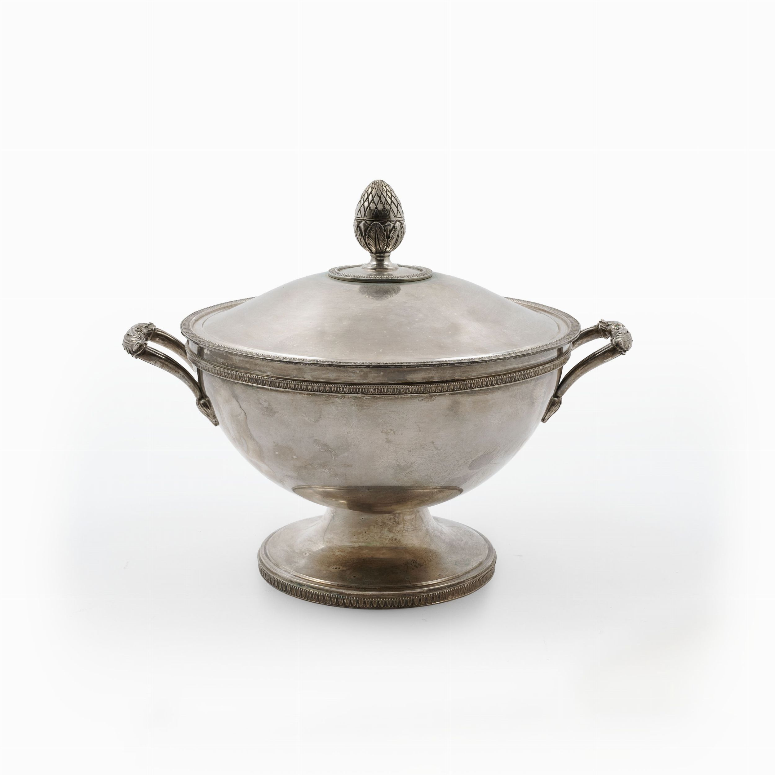 Italia, metà XX secolo base rotonda, fusto liscio, manici con decori fogliacei, coperchio con presa a pigna, decoro in stile Impero, punzoni del Fascio.