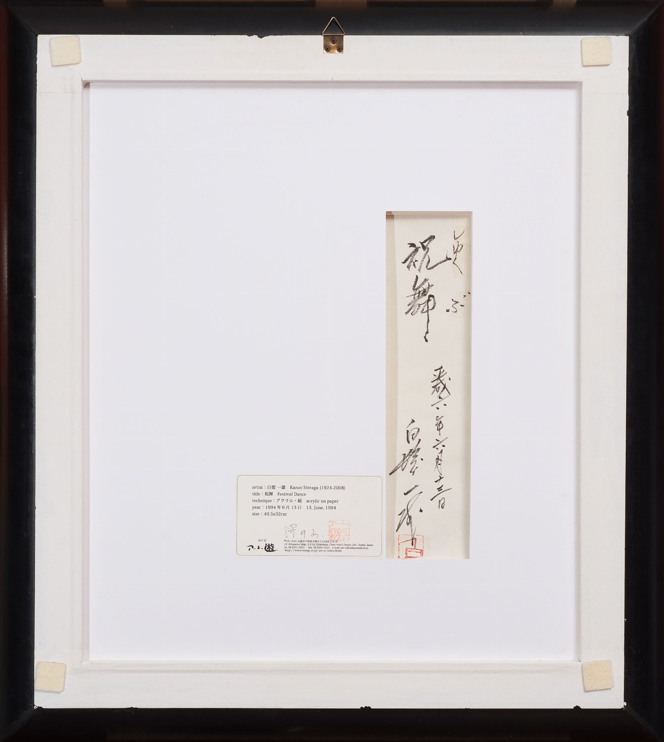 Negli anni finali del percorso artistico le opere di Shiraga iniziano ad assumere un vigore sereno, con colori brillanti applicati in modo gioioso sulla tela, come a dimostrare una esorcizzazione dei demoni combattuti in passato. Ne è un perfetto esempio “Festival dance”, il luminoso e colorato acrilico su carta datato 1994 qui presentato.