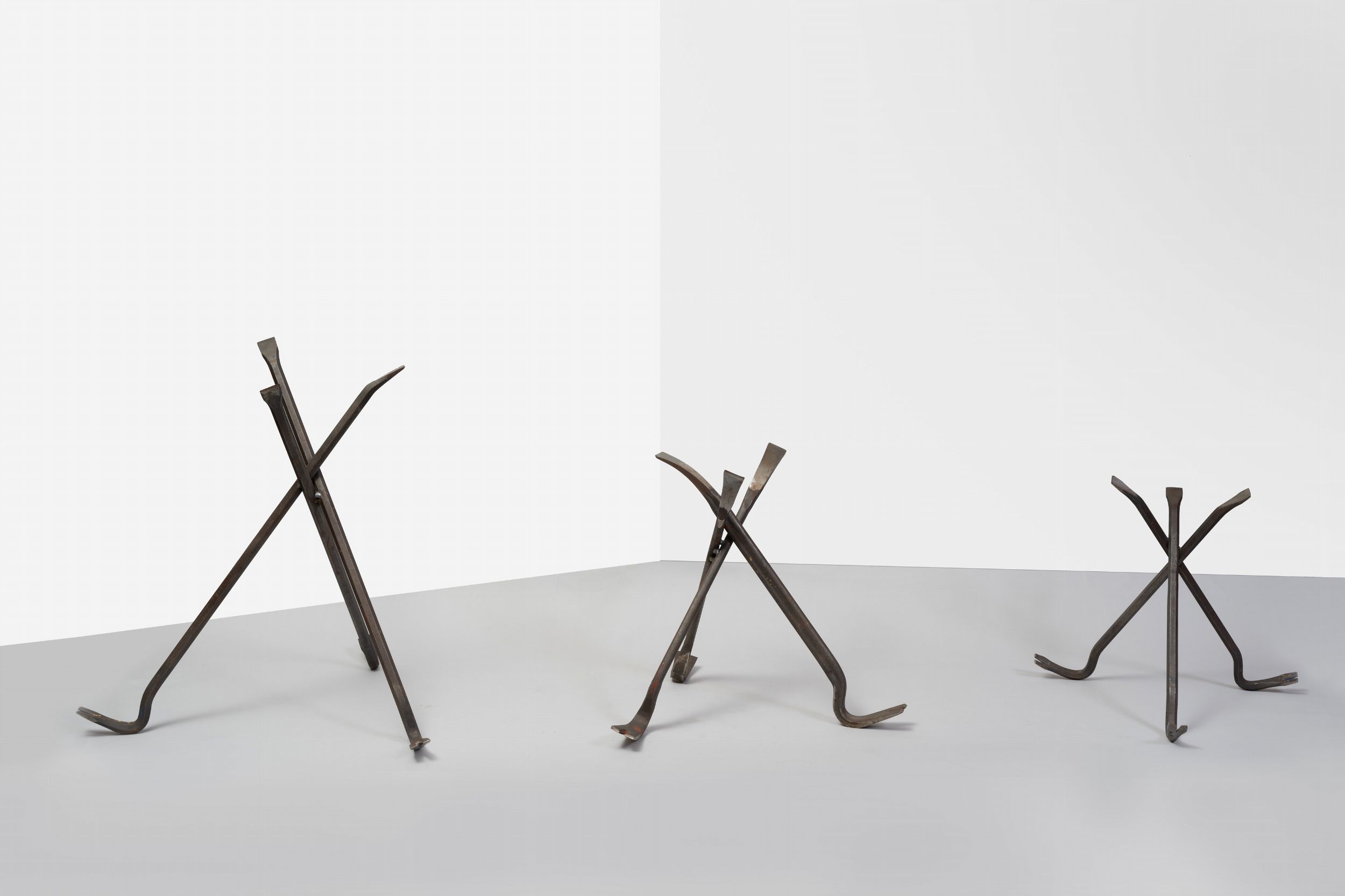 n.3 sculture in ferro composte ciascuna da n.3 piedi di porco, h 65,5 cm (prima scultura), h 46 cm (seconda scultura), h 40 cm (terza scultura)