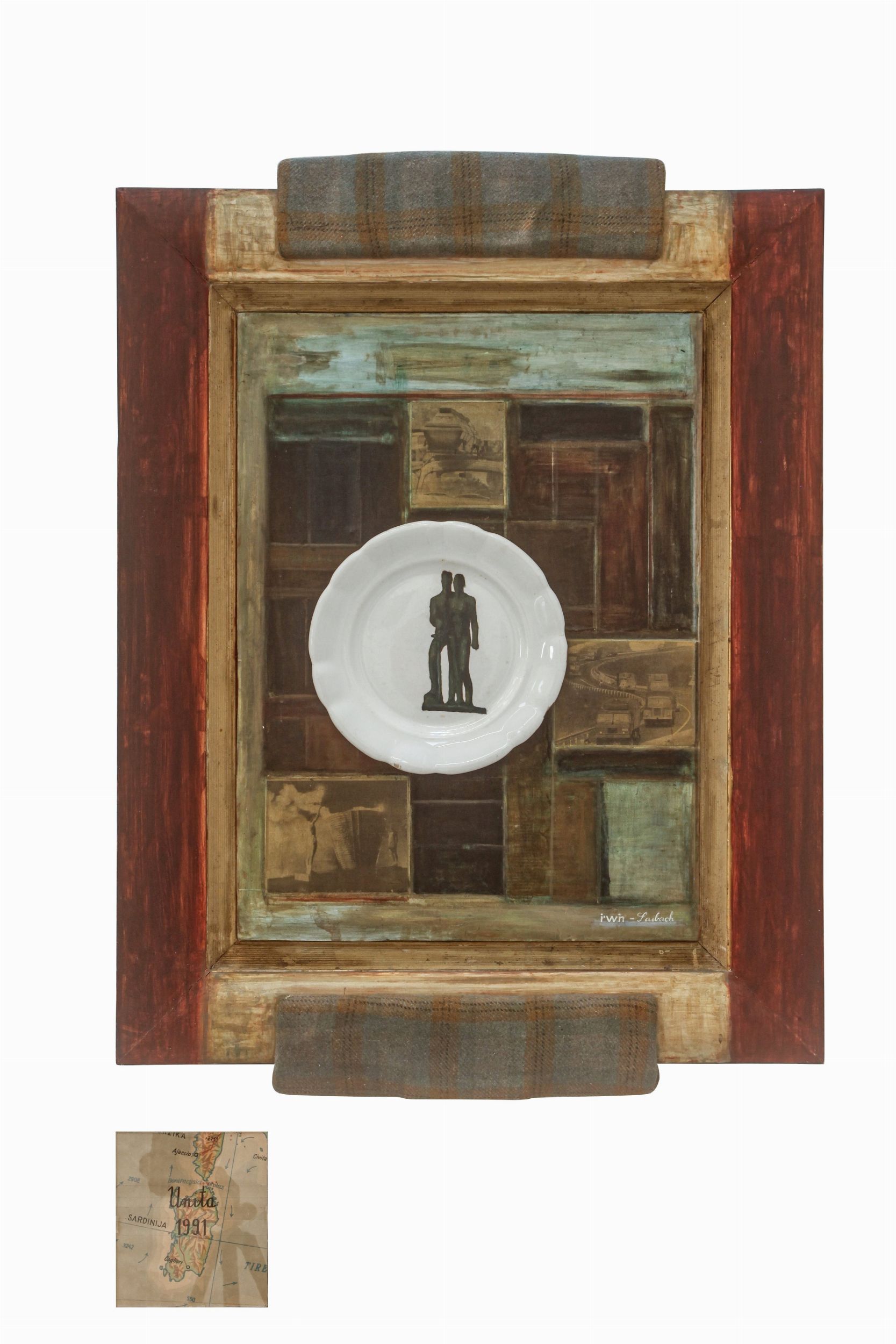 Olio, tecnica mista e assemblaggio di piatto in ceramica dipinto a collage di tavola di legno, corni, cm 88x65x5