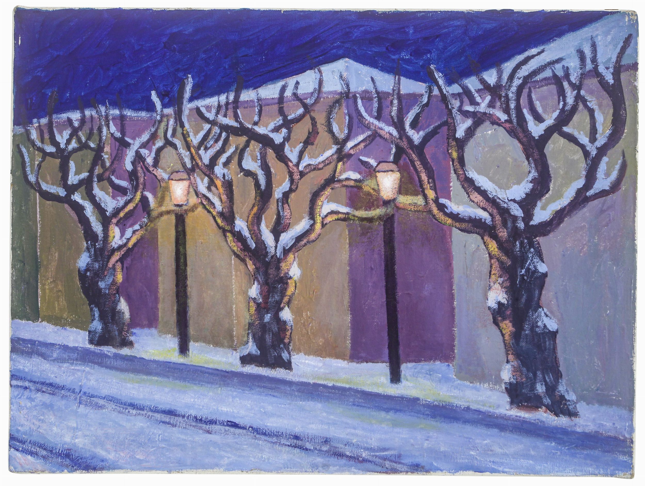 L’olio su tela qui presentato, realizzato nel 1979, è assai raro per la produzione di Salvo, perché tra le prime opere pittoriche realizzate dall’artista. Infatti a partire dal 1973, in seguito al cambio di rotta rispetto alle ricerche precedenti, avviene in Salvo, pseudonimo di Salvatore Mangione (Leonforte, 1947 - Torino, 2015), il ritorno alla pittura, con quello stile che lo ha reso inconfondibile nel panorama artistico contemporaneo. Il soggetto qui rappresentato è infatti un riuscitissimo paesaggio innevato con tre alberi e due lampioni, tra i primissimi di questo genere all’interno della sua produzione artistica.