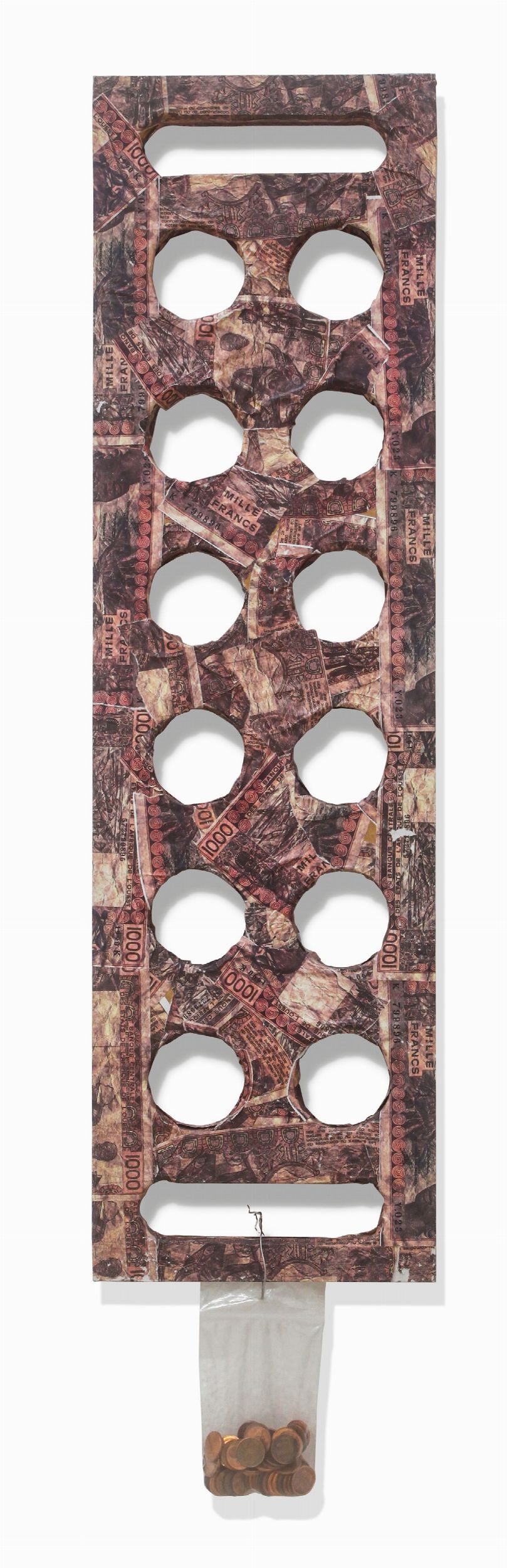 Legno, carta-moneta e monete, cm 67x19x5