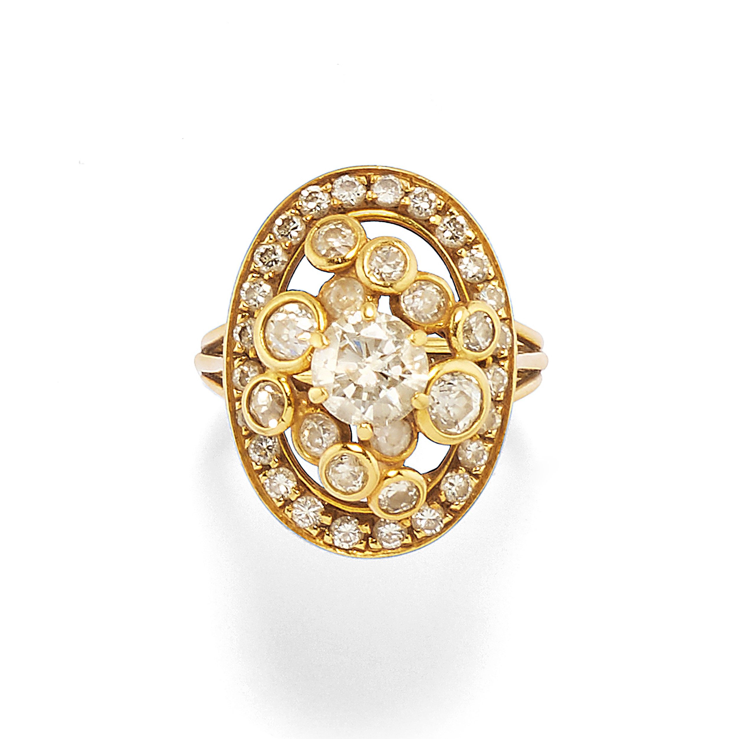 in oro giallo 18k, Peso g 7,60 misura a sommità ovale, al centro un diamante taglio brillante di ct 1,00 circa (prob. colore J/K, purezza P) e diamanti taglio vecchio e brillante e decoro per totale ct 1,00 circa, difetti (visibili mancanze di materiale nel diamante centrale).
