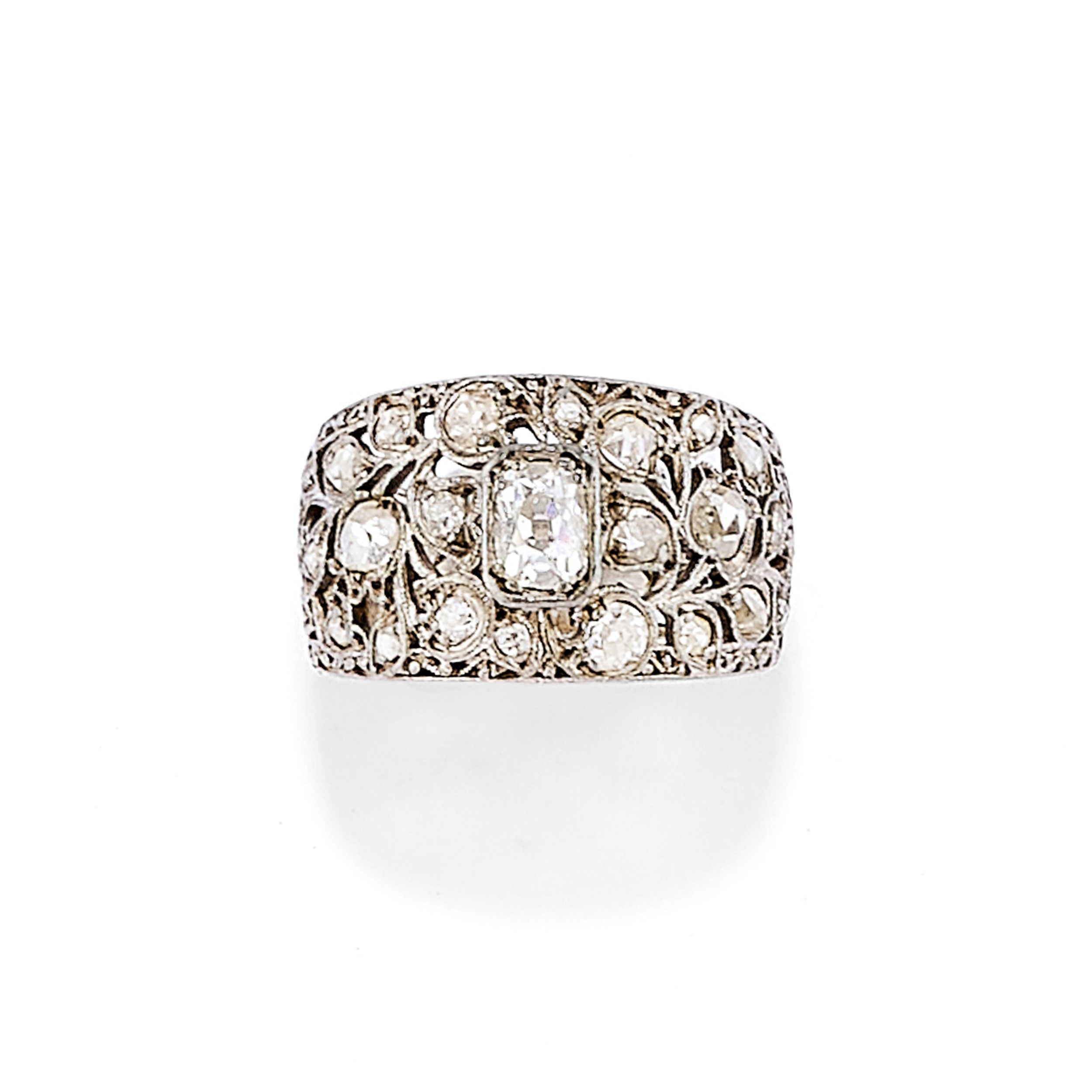 a fascia traforata con elementi fogliacei, al centro diamante taglio cuscino di ct 0,50 circa, diamanti taglio vecchio e rosa a decoro.