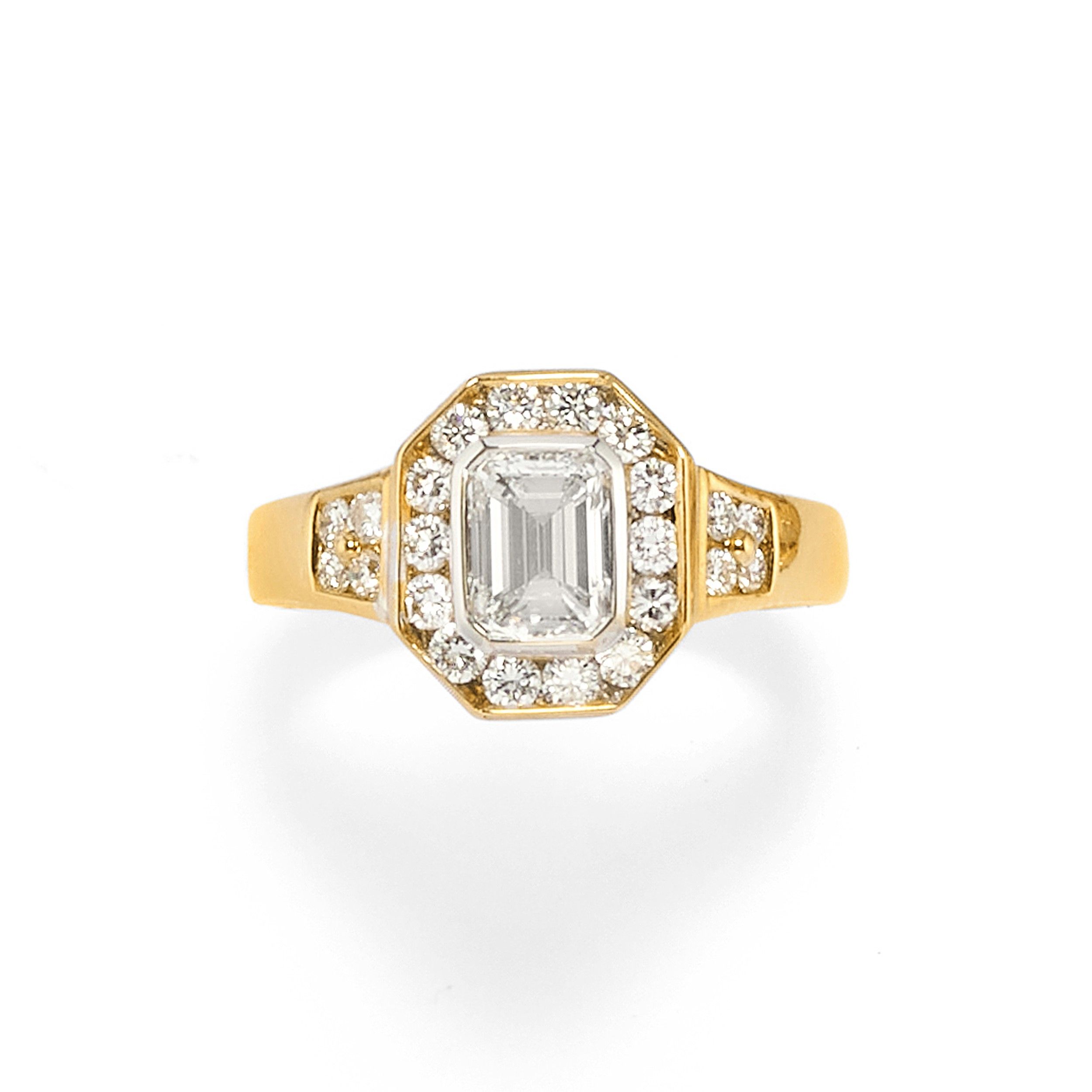 al centro diamante taglio rettangolare a contorno ottagonale di ct 0,70 circa, decoro in diamanti taglio brillante.