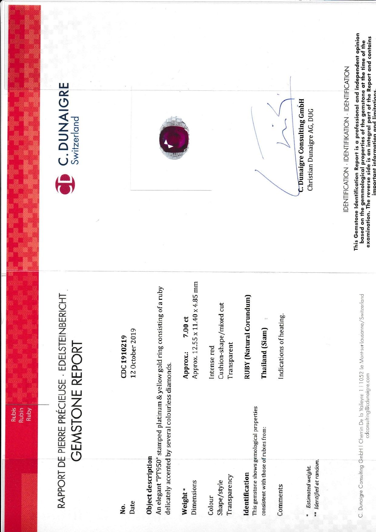 montatura impreziosita da diamanti taglio baguette e fantasia per totale ct 3,00 circa, al centro rubino Thailand (Siam) taglio cuscino di ct 7,00 circa.