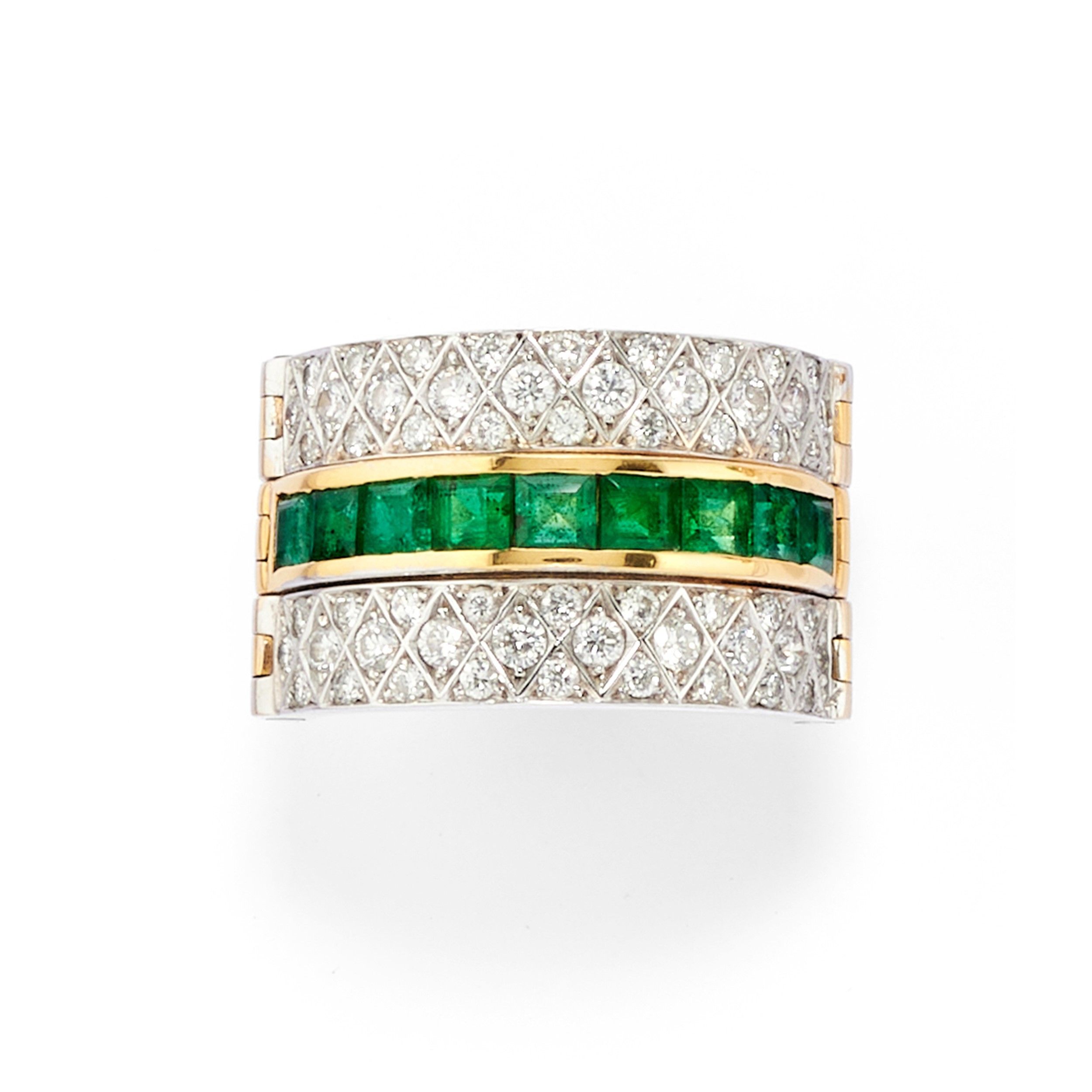 a fascia, percorso al centro da smeraldi taglio carrè incastonati a binario per totale ct 1,00 circa e diamanti taglio brillante per totale ct 0,90 circa.