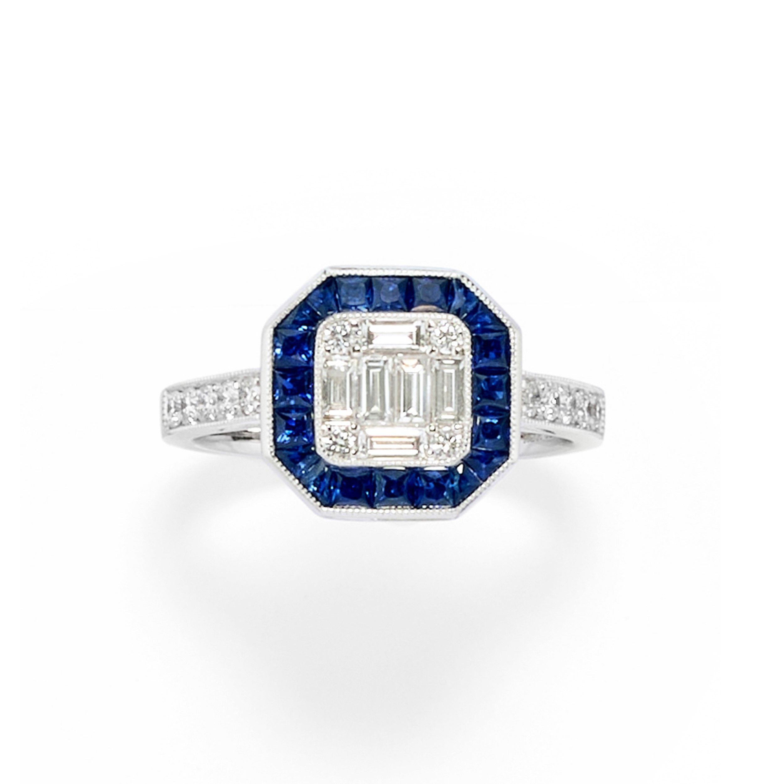 con diamanti taglio brillante e baguette per totale ct 0,61 (caratura incisa) e zaffiri taglio carrè per totale ct 0,91 (caratura incisa).
