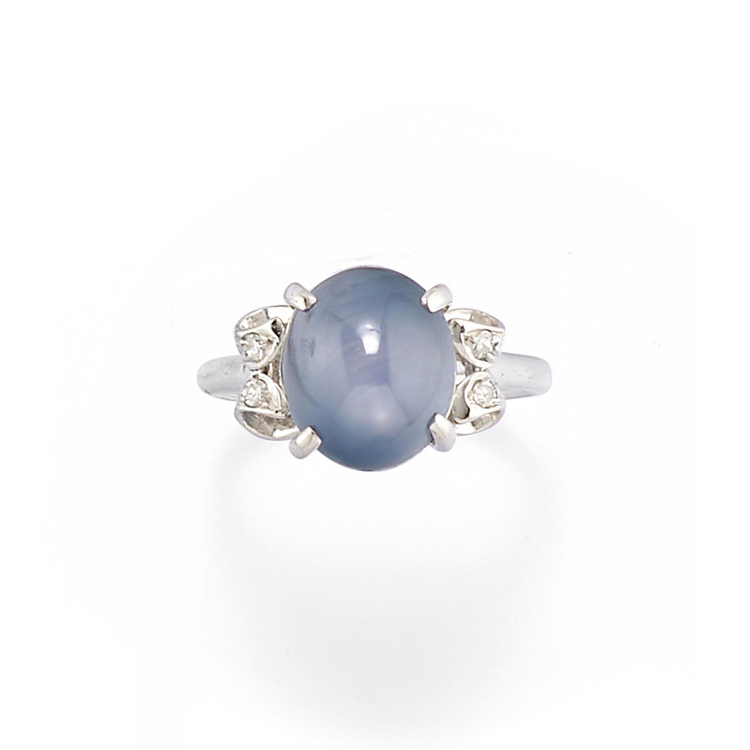 al centro zaffiro cabochon di ct 7,42 (caratura incisa) e ai lati quattro diamanti taglio huit-huit a decoro.