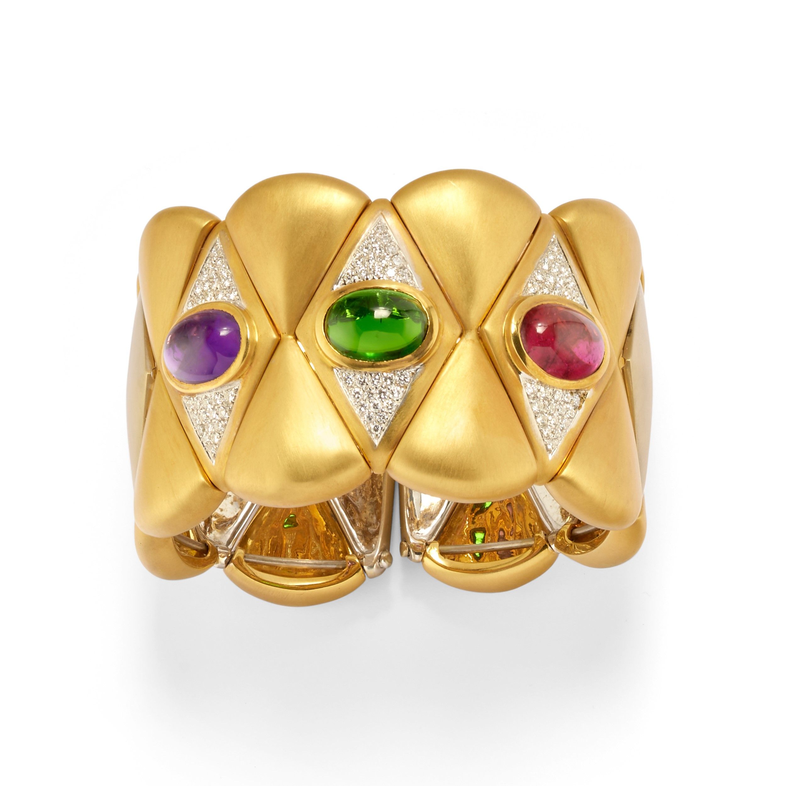 in oro bicolore 18k, Peso g 115,80 diametro cm 6,00 - h cm 4,20 a schiava, al centro tre pietre di colore taglio ovale cabochon (prob. ametista, tormalina rossa e verde) su motivi romboidali impreziositi da diamante taglio brillante per totale ct 1,50 circa.