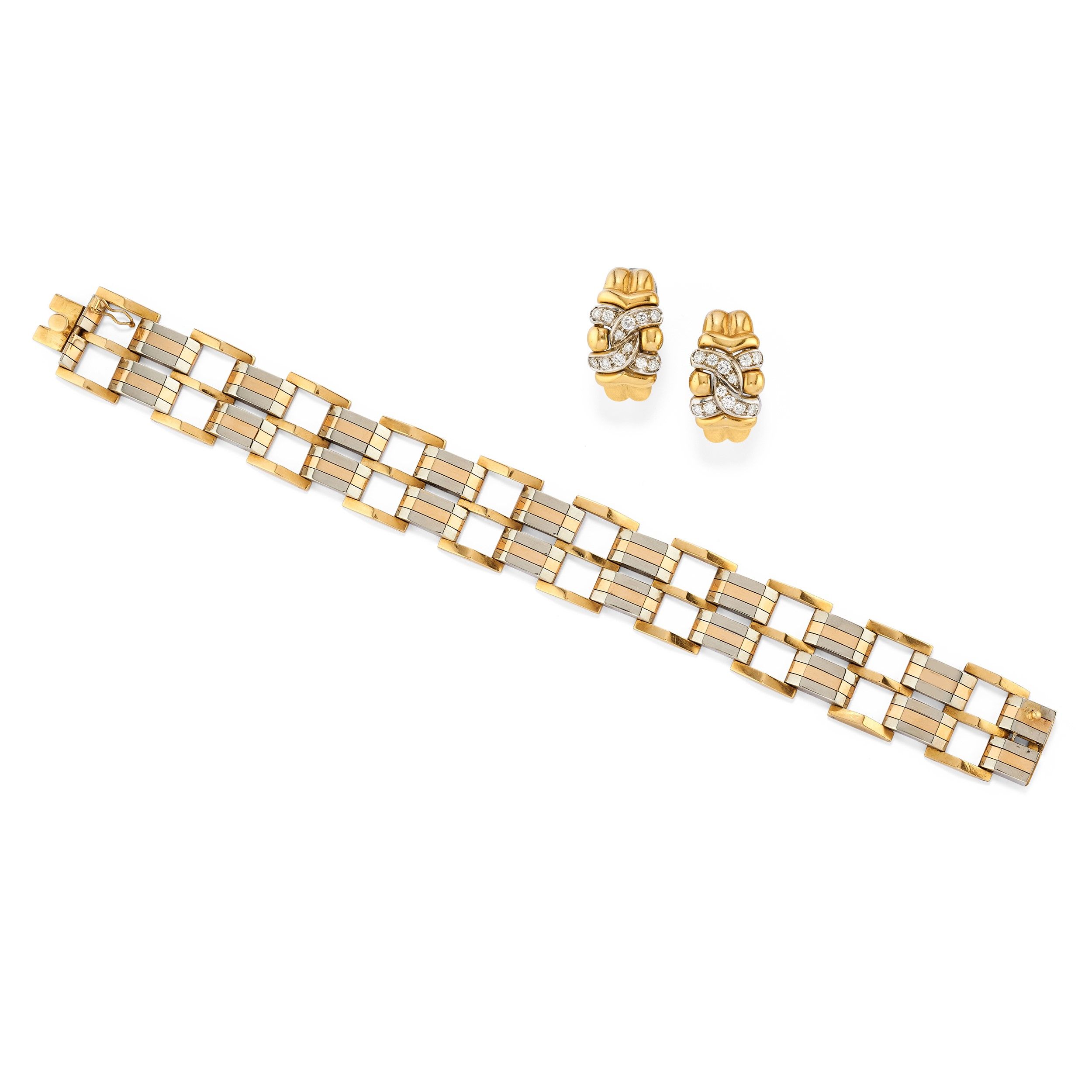 bracciale in oro scatolato con punzoni del Fascio e orecchini impreziositi da diamanti taglio brillante, chiusura con perno e clip.