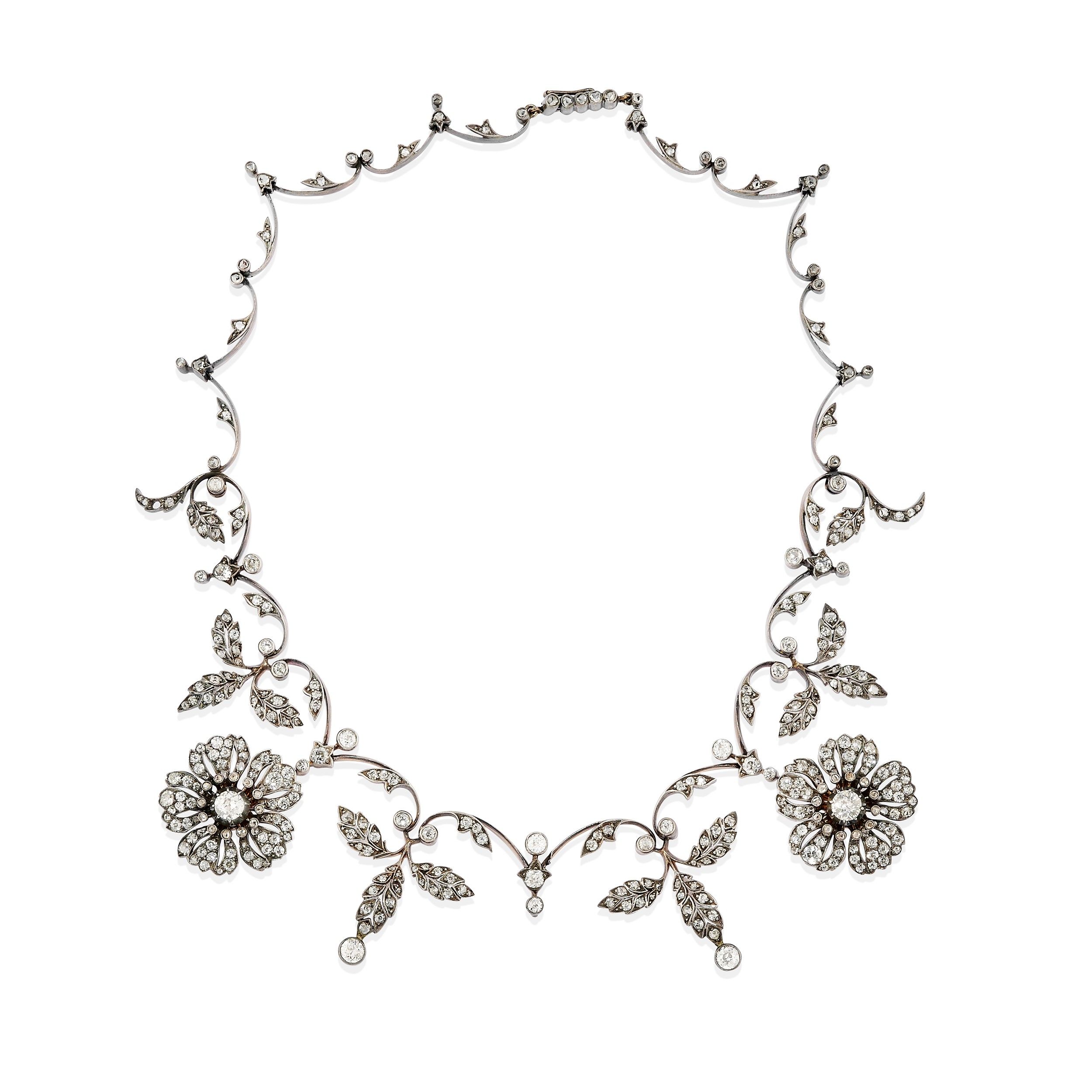 XIX secolo realizzata a fiori e foglie in diamanti taglio vecchio e rosa per totale ct 10,00 circa, con astuccio, difetti (centrale a fiore mancante).