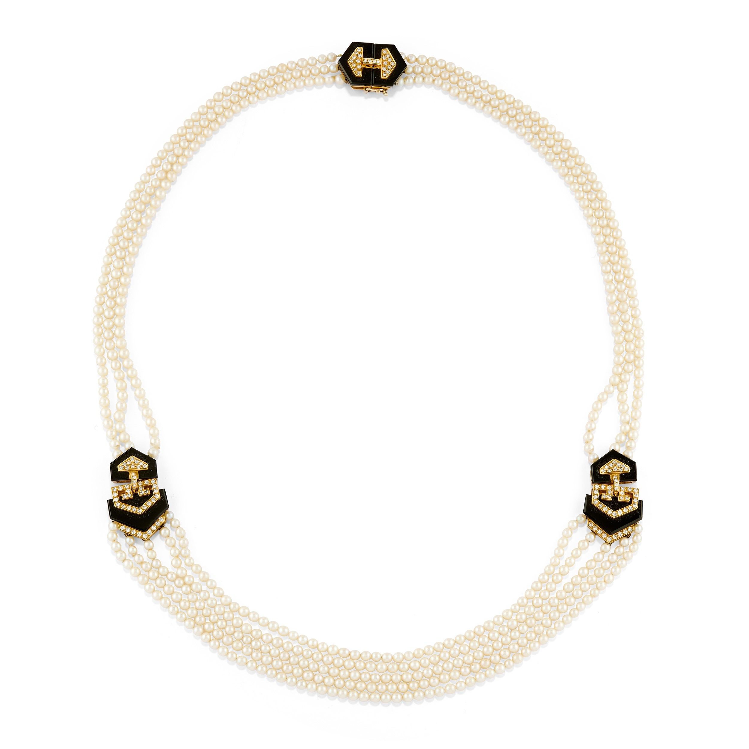 in oro giallo 18k, Peso g 55,90 cm 56,00 parte superiore a tre fili e parte inferiore a quattro fili di perle coltivate di mm 3,00/3,50 circa intervallati da tre settori geometrici in onice impreziositi da diamanti taglio huit-huit per totale ct 1,00 circa.