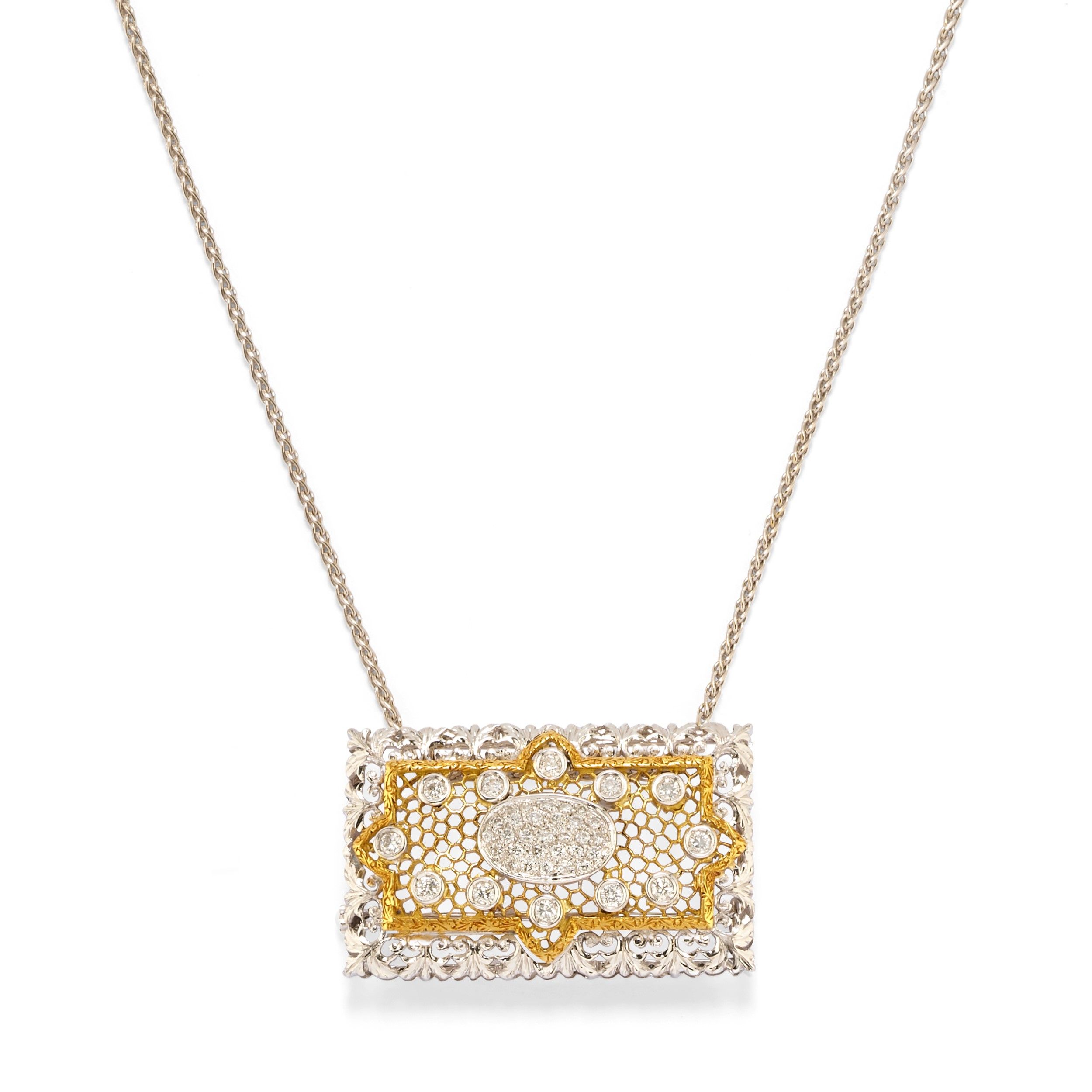 con centrale scorrevole e indossabile anche come spilla, di forma rettangolare, traforato a pizzo e impreziosito da diamanti taglio brillante per totale ct 1,00 circa.