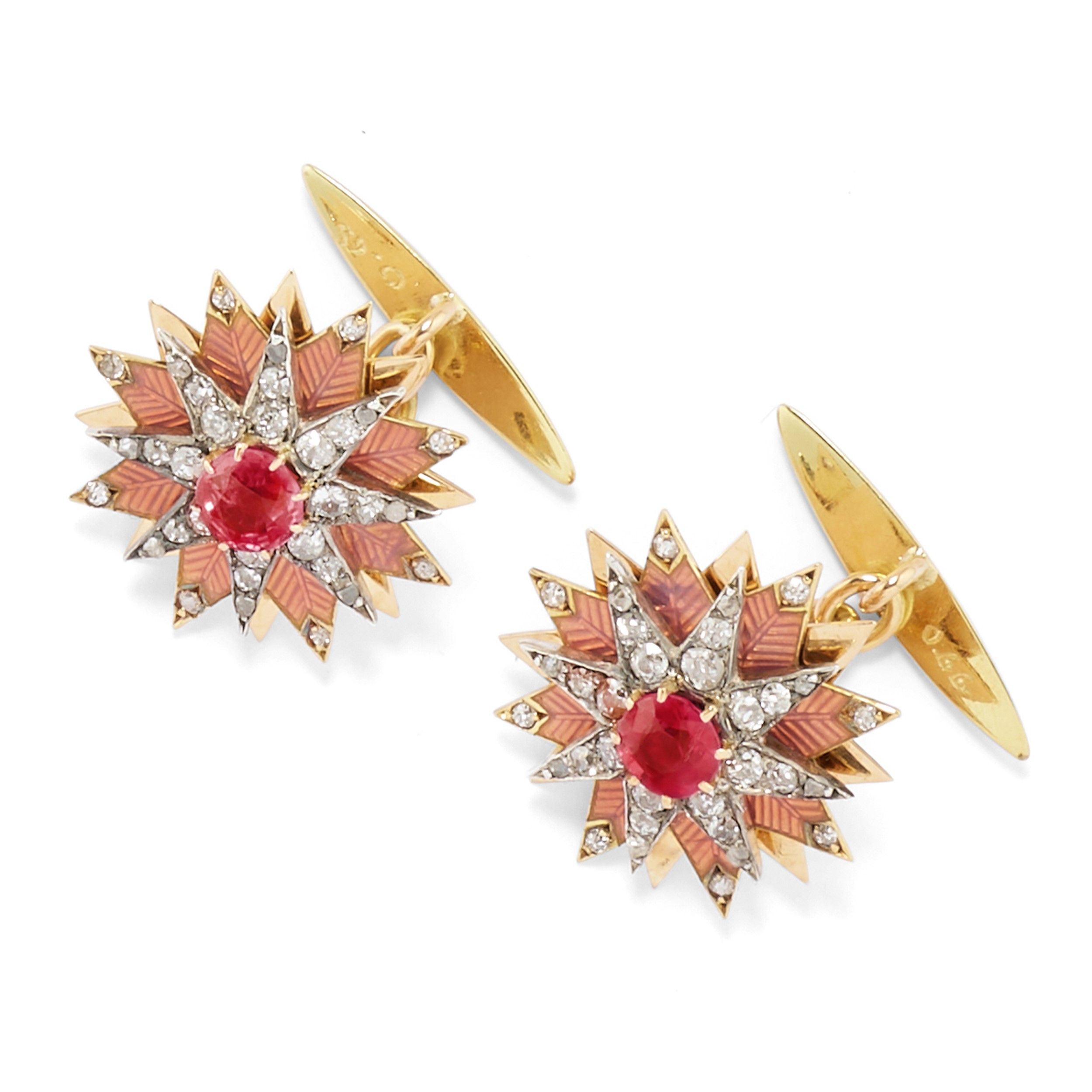 realizzati a stella, decoro in smalto rosa, diamanti taglio vecchio e rosa, al centro due rubini Burma taglio rotondo di ct 0,65 e 0,66 (carature incise).