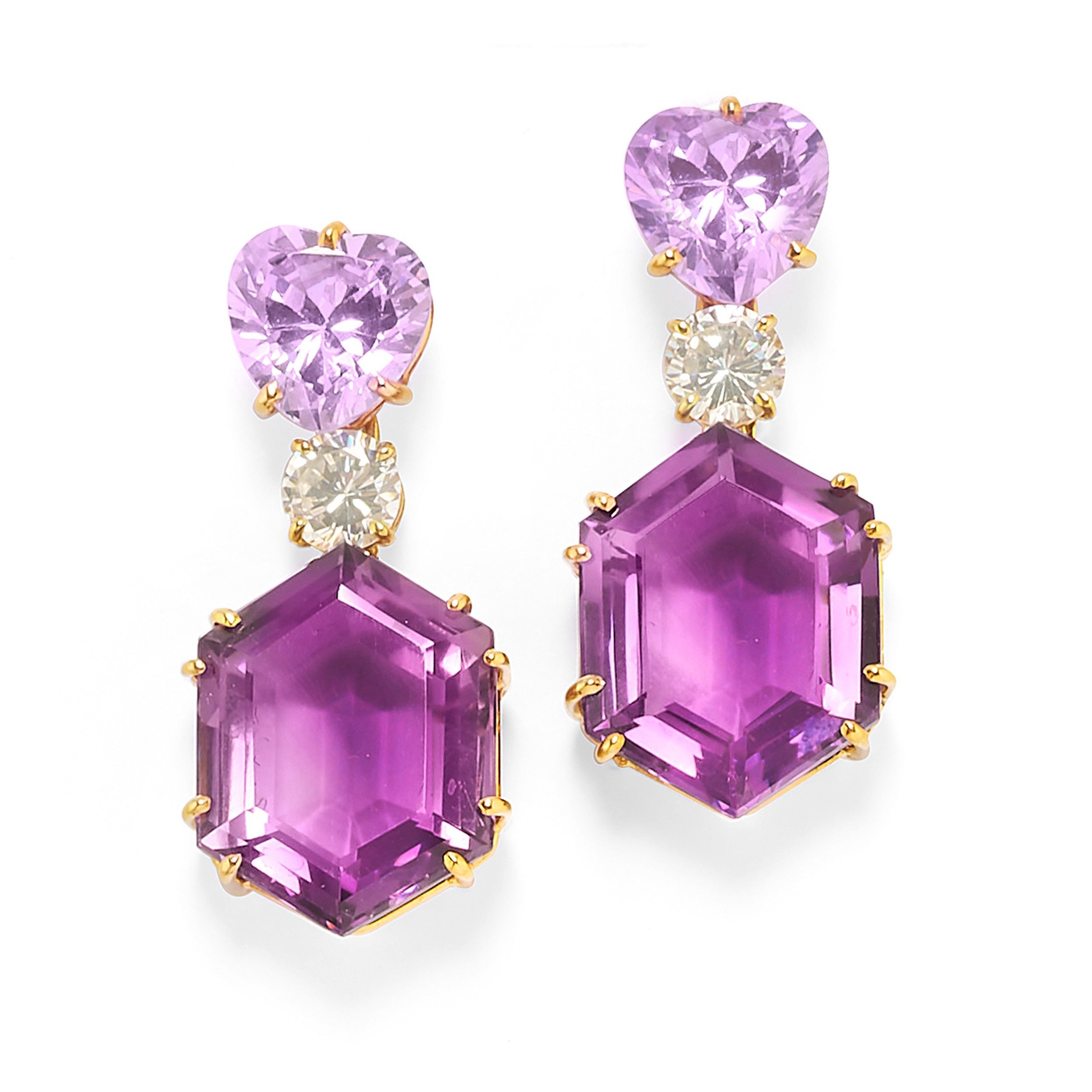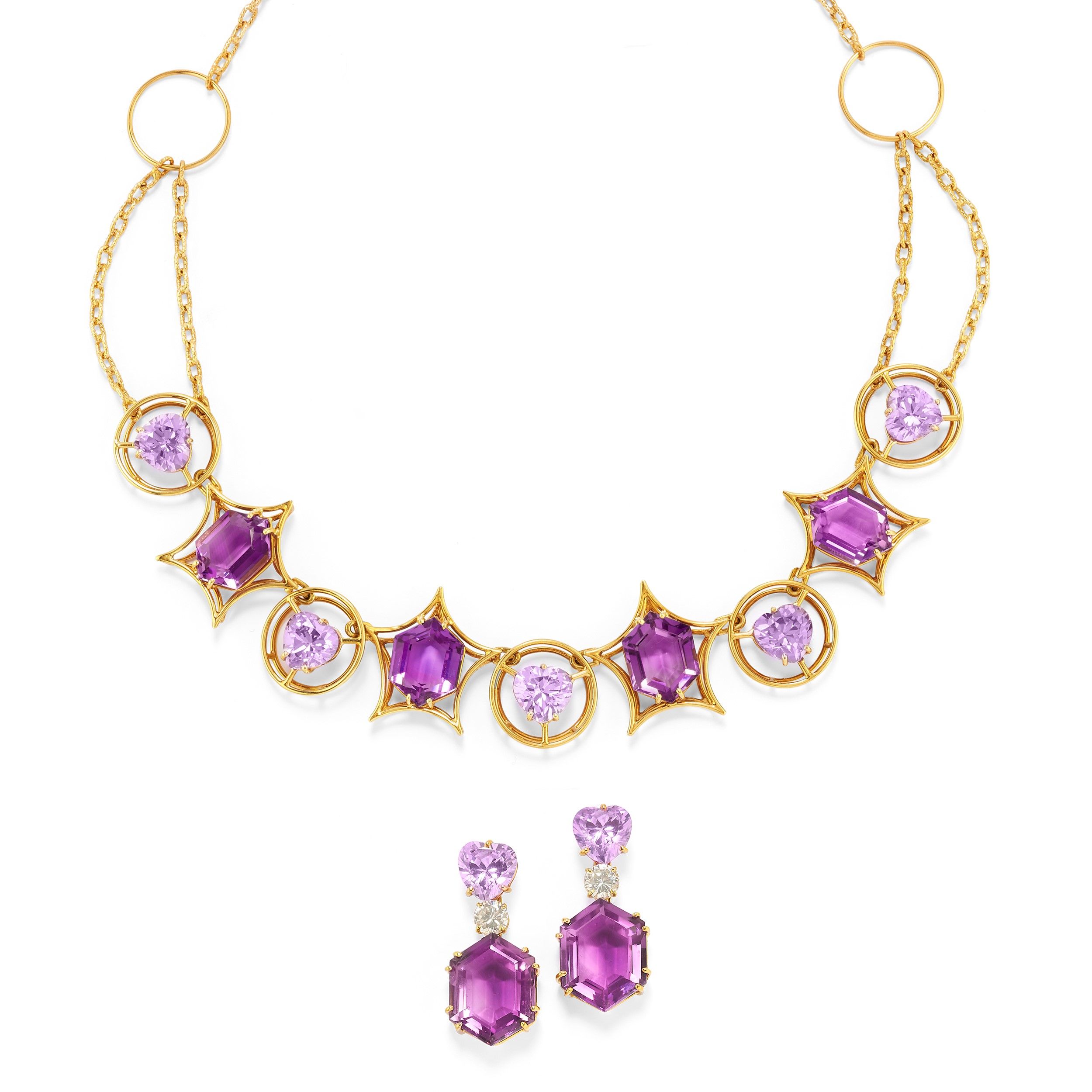 composta da collana e coppia di orecchini pendenti con chiusura perno e farfalla, ametiste taglio esagonale, pietre rosa taglio cuore e diamanti incolori sintetici.