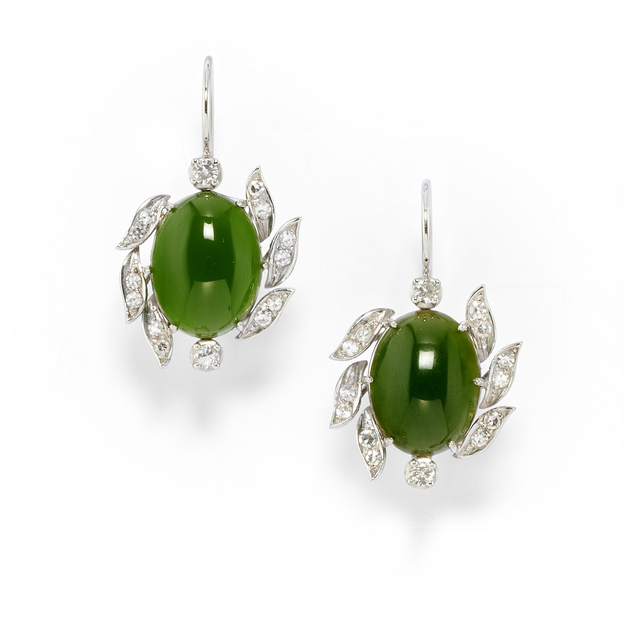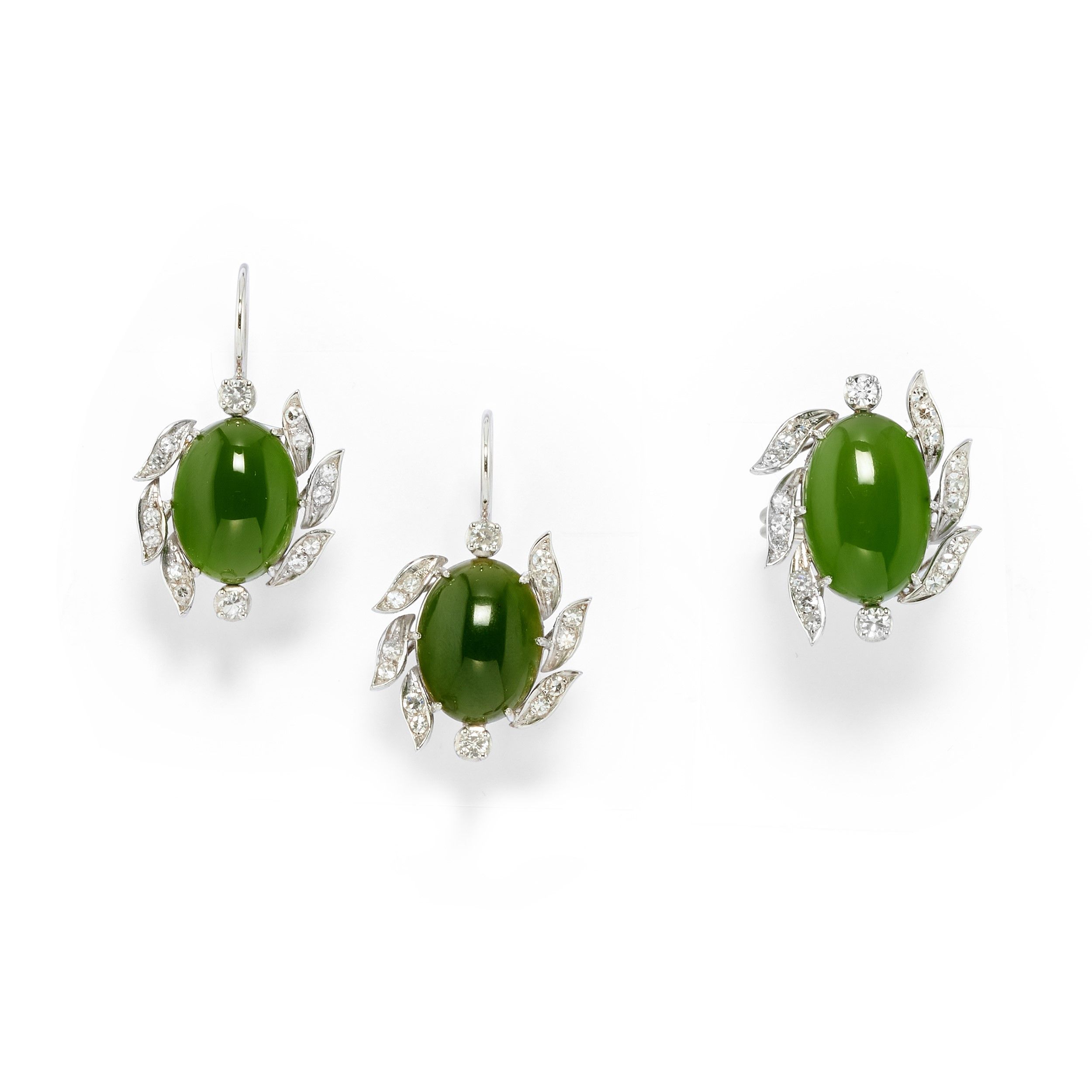 in oro bianco 18k, Peso g 18,10 misura 15 cm 2,00x3,50 composta da anello e coppia di orecchini con chiusura monachella e clip, con inserti in giada giadeite verde spinacio taglio ovale cabochon, diamanti taglio brillante e huit-huit per totale ct 1,50 circa.
